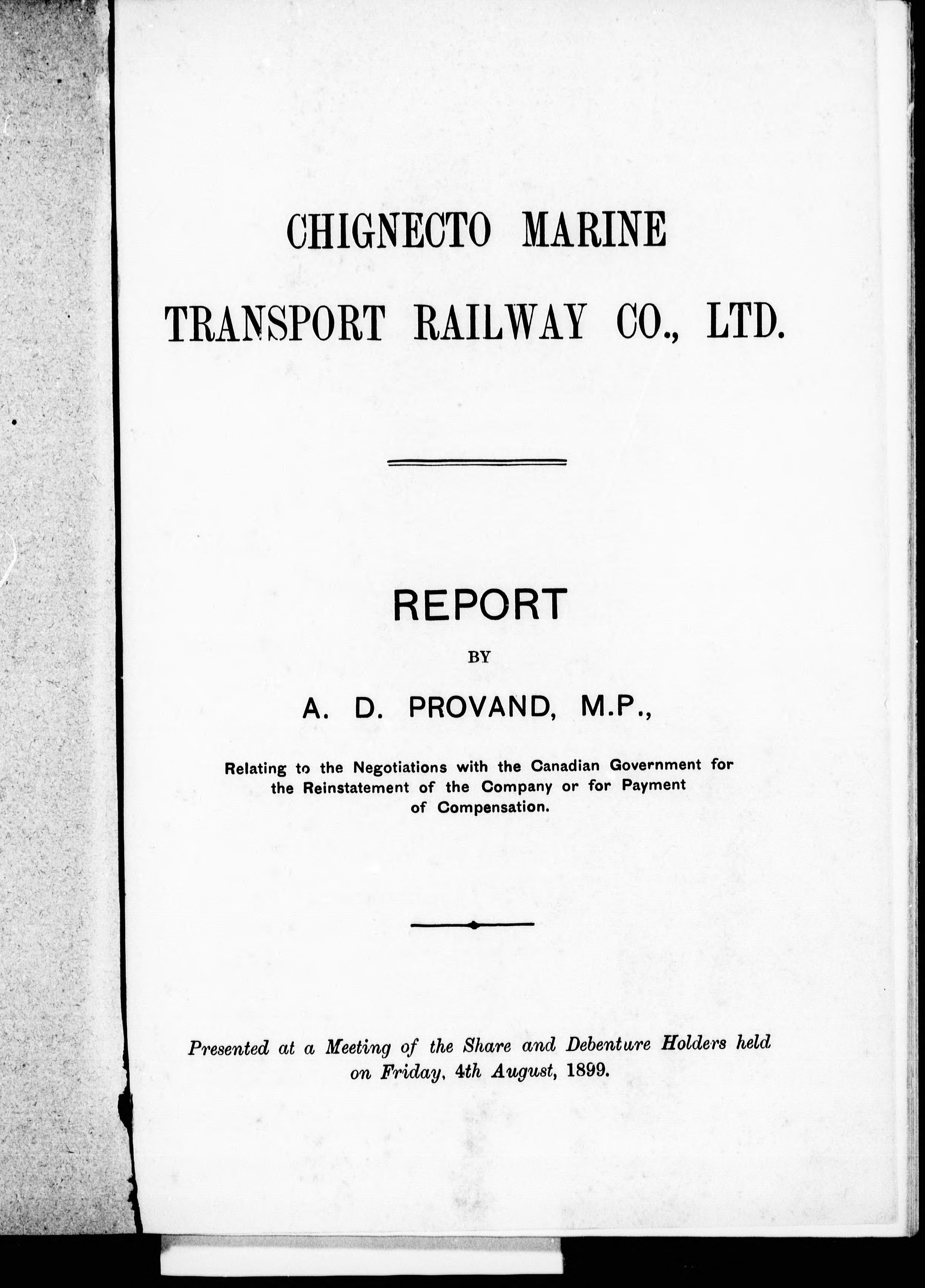 Chignecto Marine Transport Railway Co., Ltd. report : report by A.D. Provand, M.P., relating to the negotiations with the Canadian Government for the reinstatement of the company or for payment of compensation.