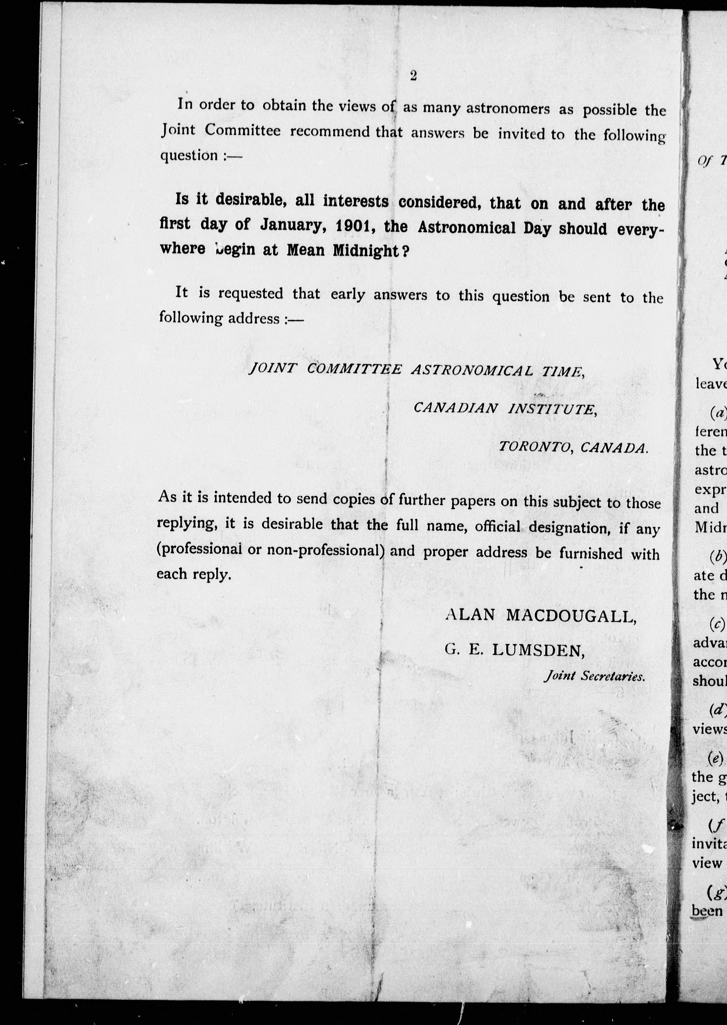 Also includes: Report of the Joint Committee of the Canadian Institute and the Astronomical and Physical Society of Toroonto ; signed Sandford Fleming.
