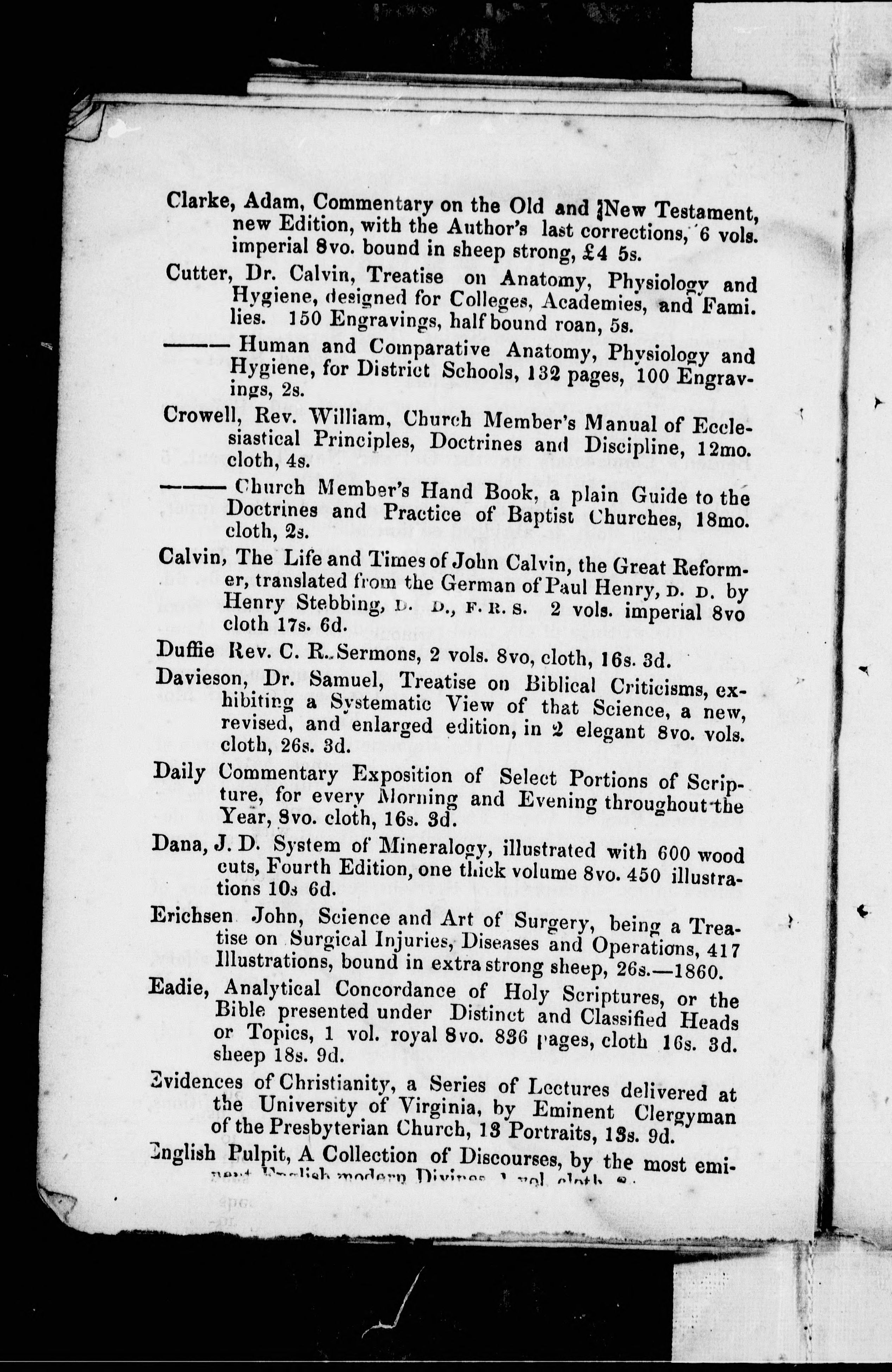 - A Catalogue of religious, scientific, illustrated, juvenile, and miscellaneous books (including educational works) : constantly kept for sale by John Bennett Strong, bookseller, stationer and news agent, Hollis Street, Halifax, 1860.