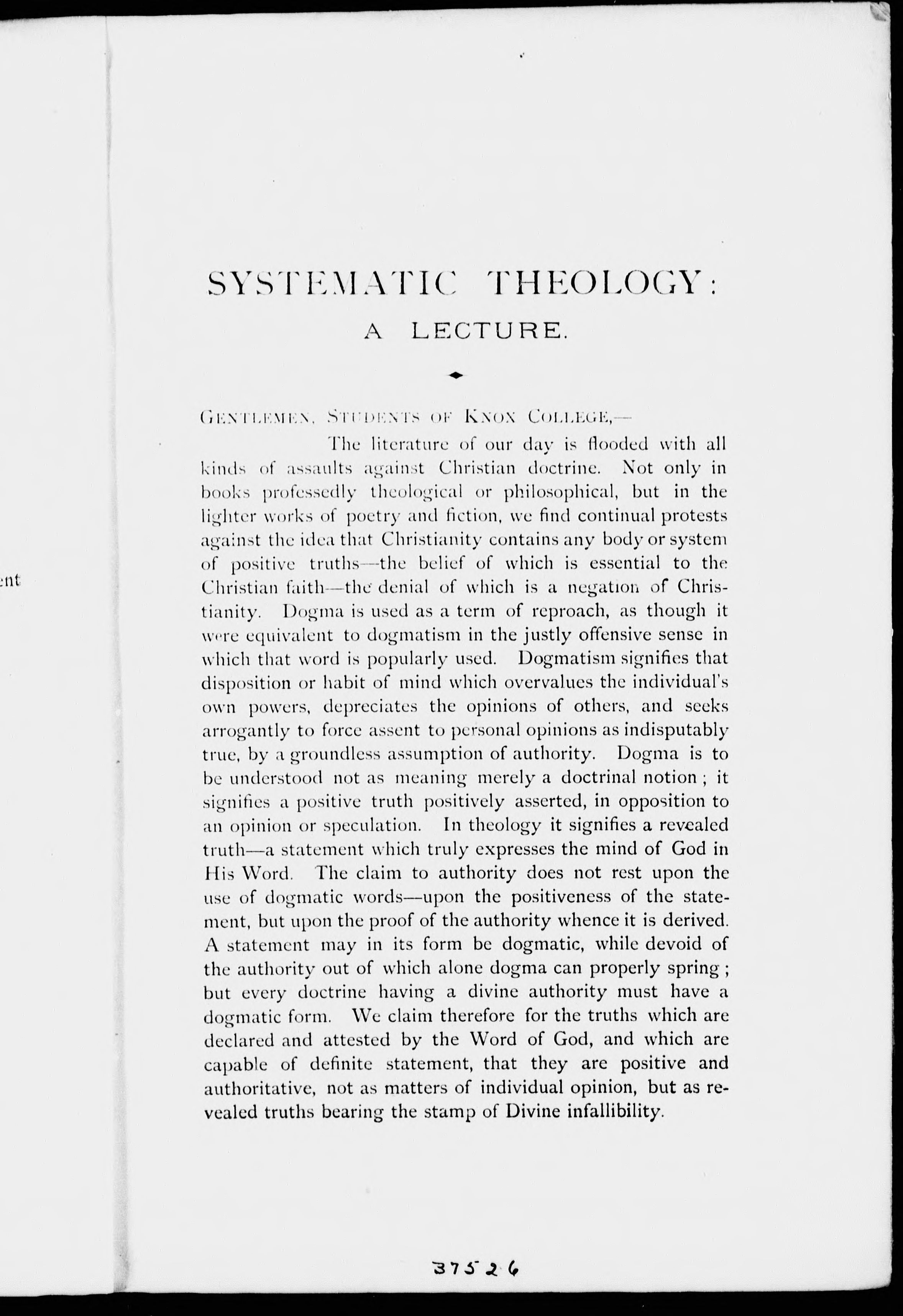 - Systematic theology in its relation to modern thought : a lecture delivered in Knox College on the 5th October 1870, at the opening of the college session
