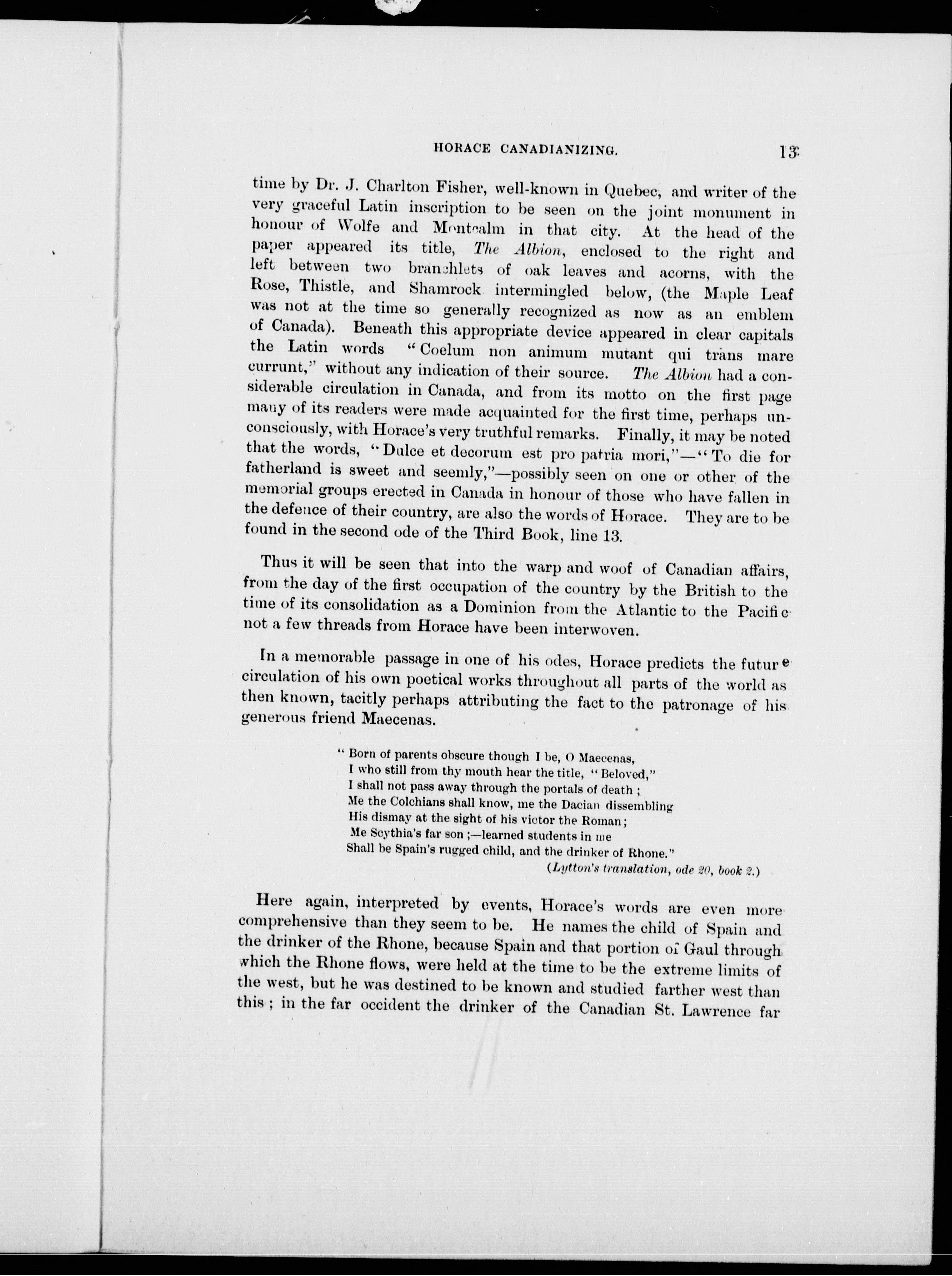 - Horace canadianizing, early pioneer life in Canada recalled by the sayings of the Latin poet Horace : being the Log shanty book-shelf pamphlet for 1894