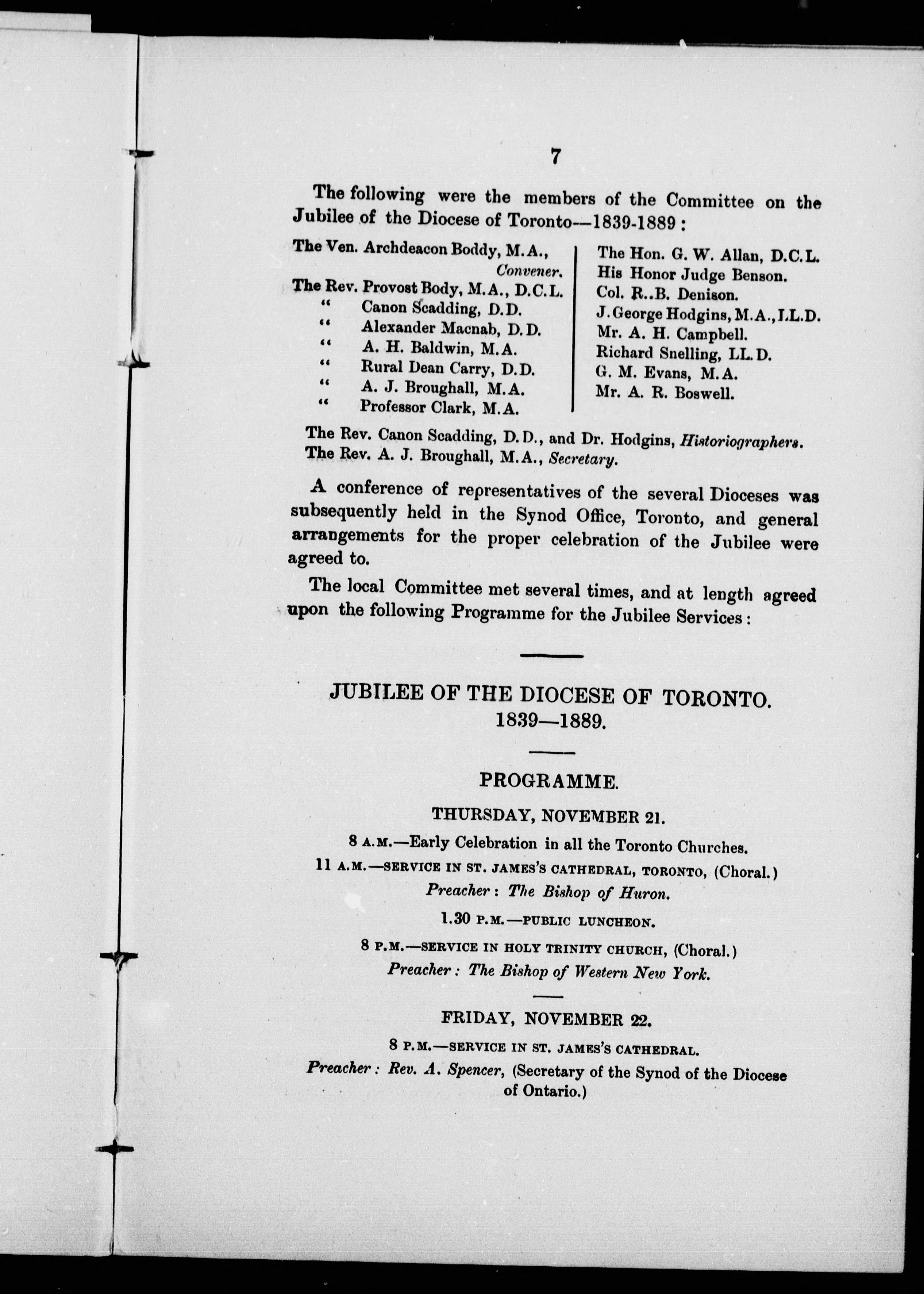 - Jubilee of the Diocese of Toronto, 1839-1889 : record of proceedings connected with the celebration of the jubilee, November 21st to the 28th, 1889, inclusive