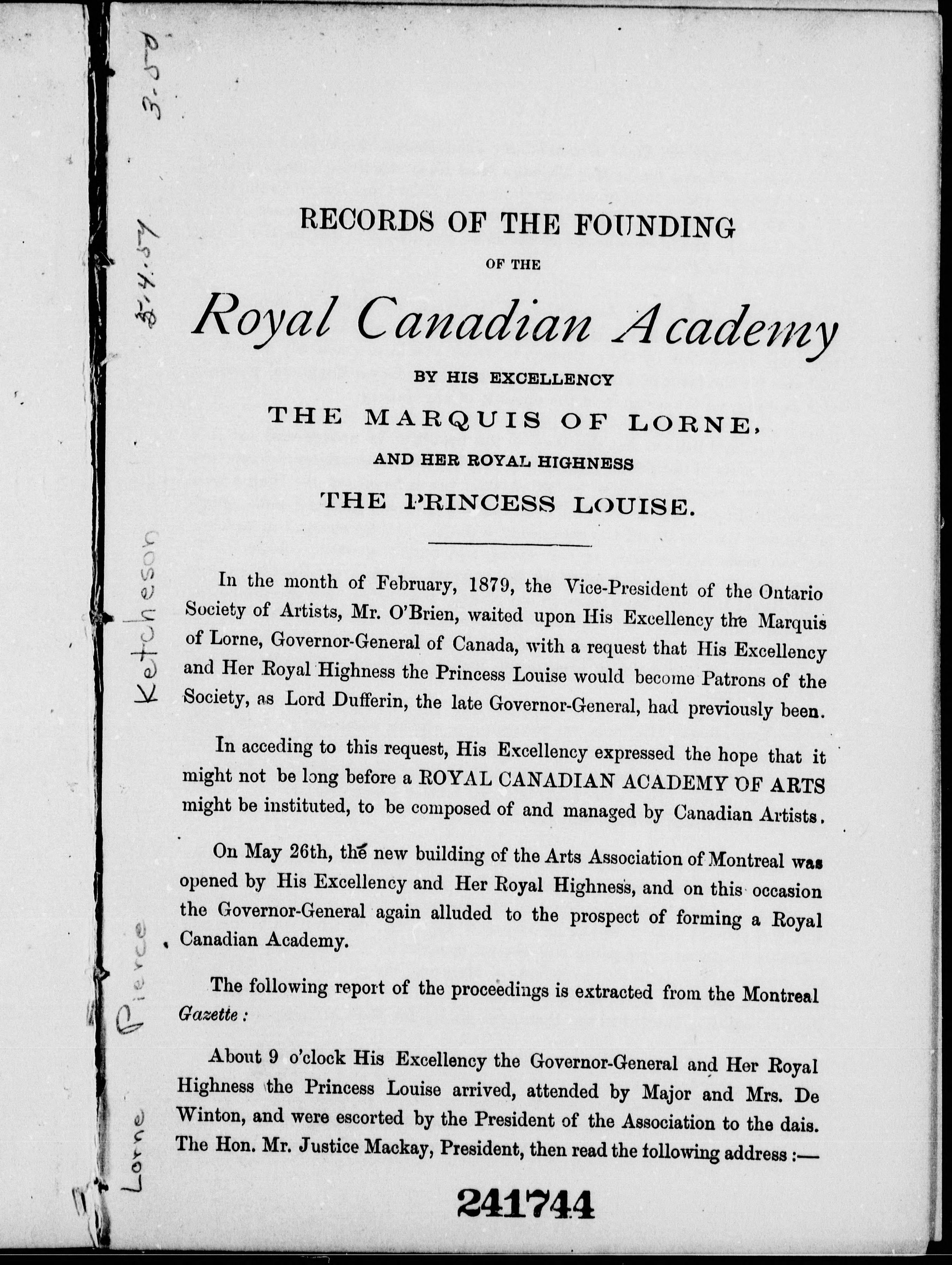Records of the founding of the Royal Canadian Academy : by His Excellency the Marquis of Lorne and Her Royal Highness the Princess Louise, 1879-80. - Published