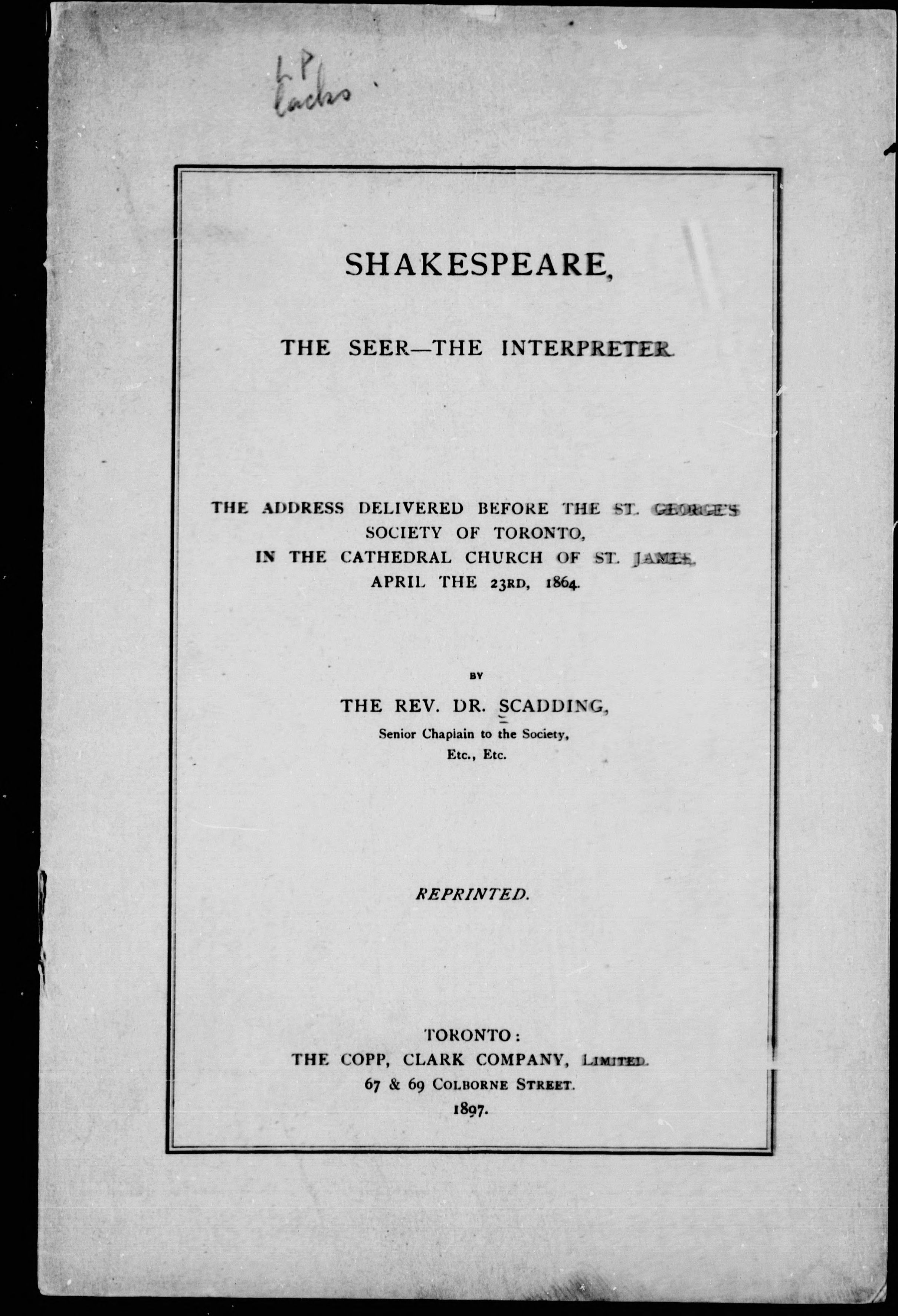 - Shakespeare, the seer--the interpreter : the address delivered before the St. George's Society of Toronto, in the cathedral church of St. James, April the 23rd, 1864