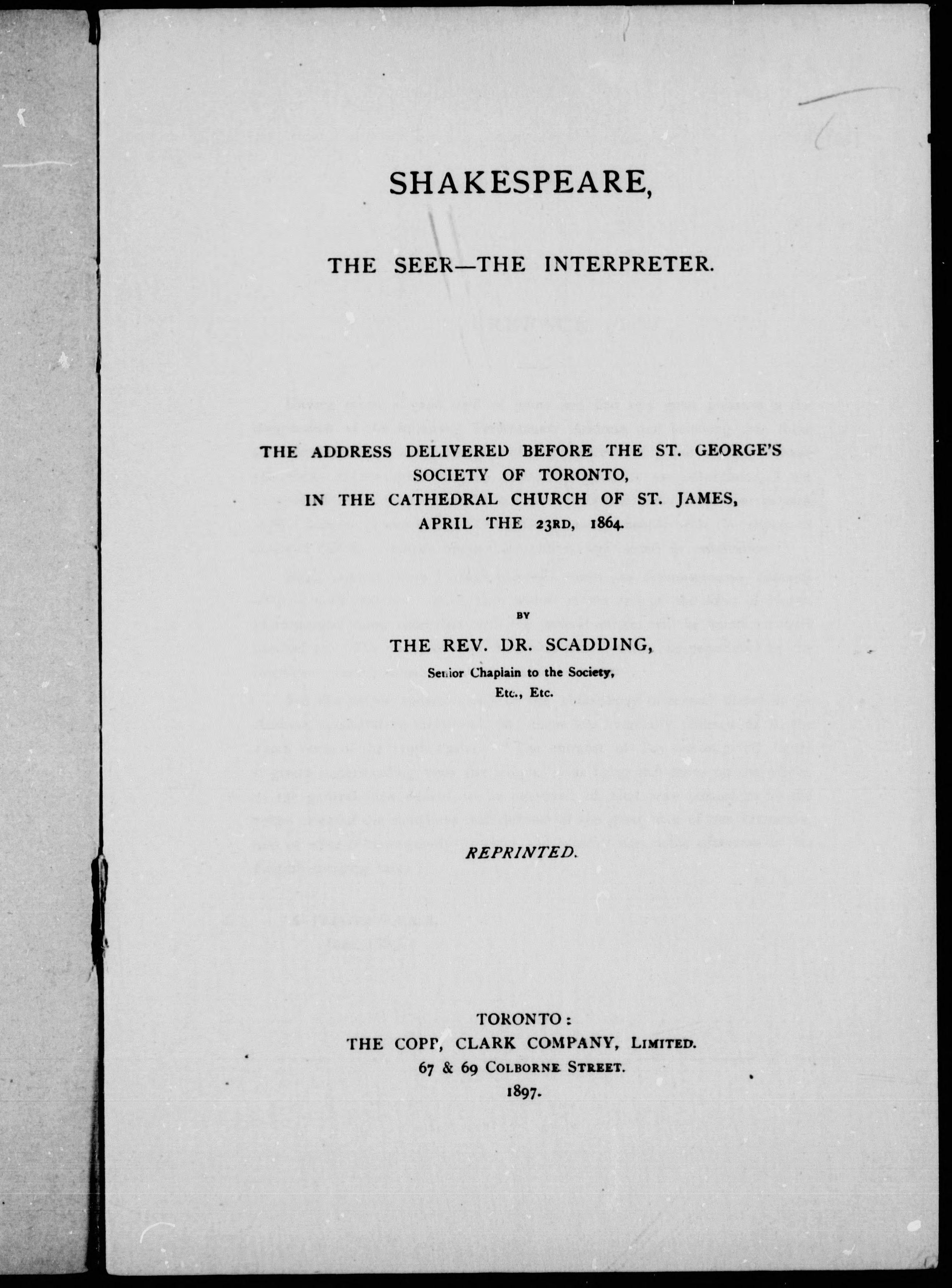 - Shakespeare, the seer--the interpreter : the address delivered before the St. George's Society of Toronto, in the cathedral church of St. James, April the 23rd, 1864