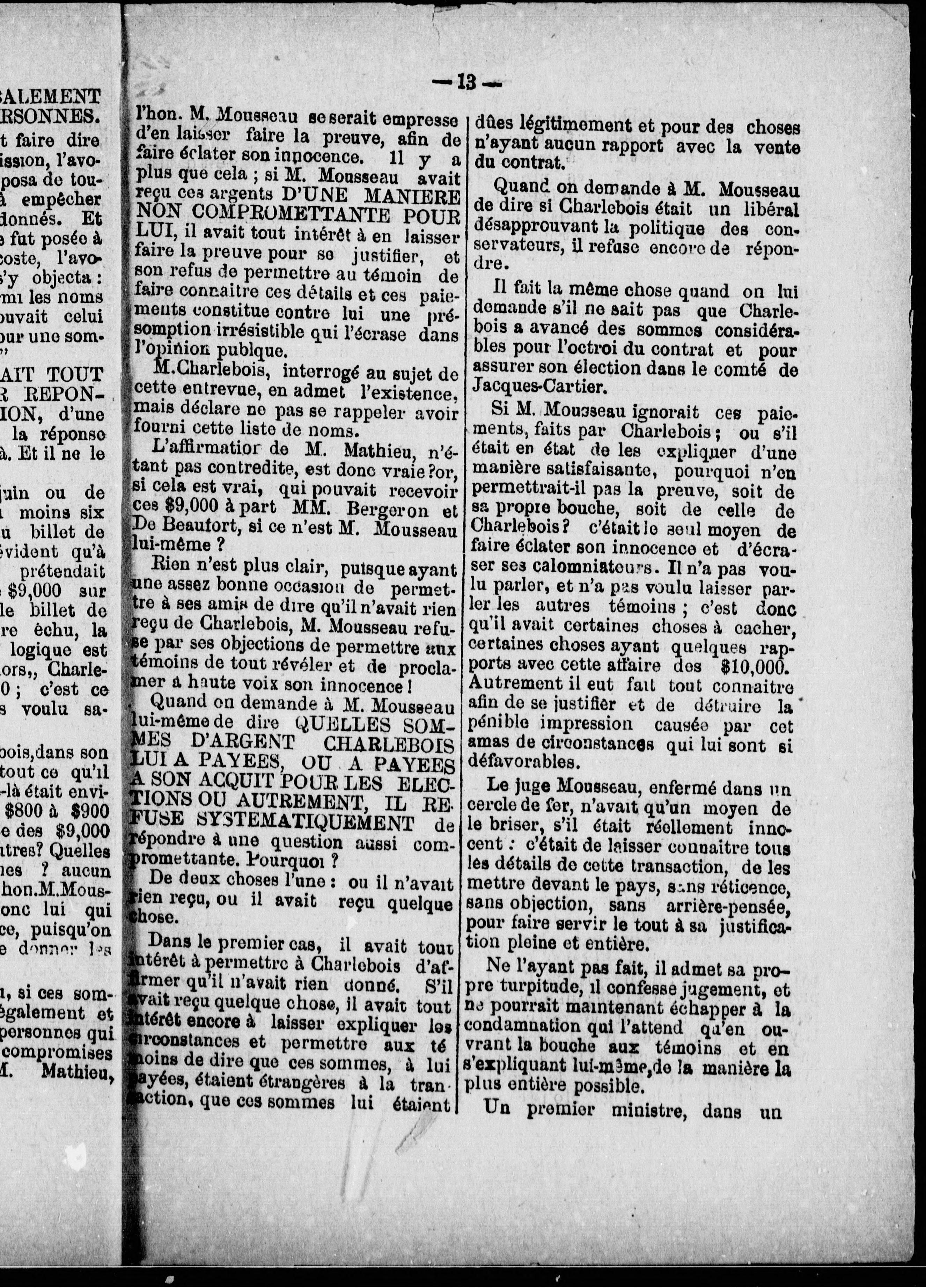 "L'accussation--Le Contrat--Lettres et dépêches--Les [rep]orts des Commissaires Conservateurs pour empêcher la preuve--Résignation de MM. Joly et Robidoux--Etat de sommes payés par le gouvernement à Charlebois pour ameublement de la salle provisoire du Parlement mis en regard de l'état du coût réel de cet ameublement--Les Commissaires ferment la bouche des témoins et Charlebois ferme les portes."