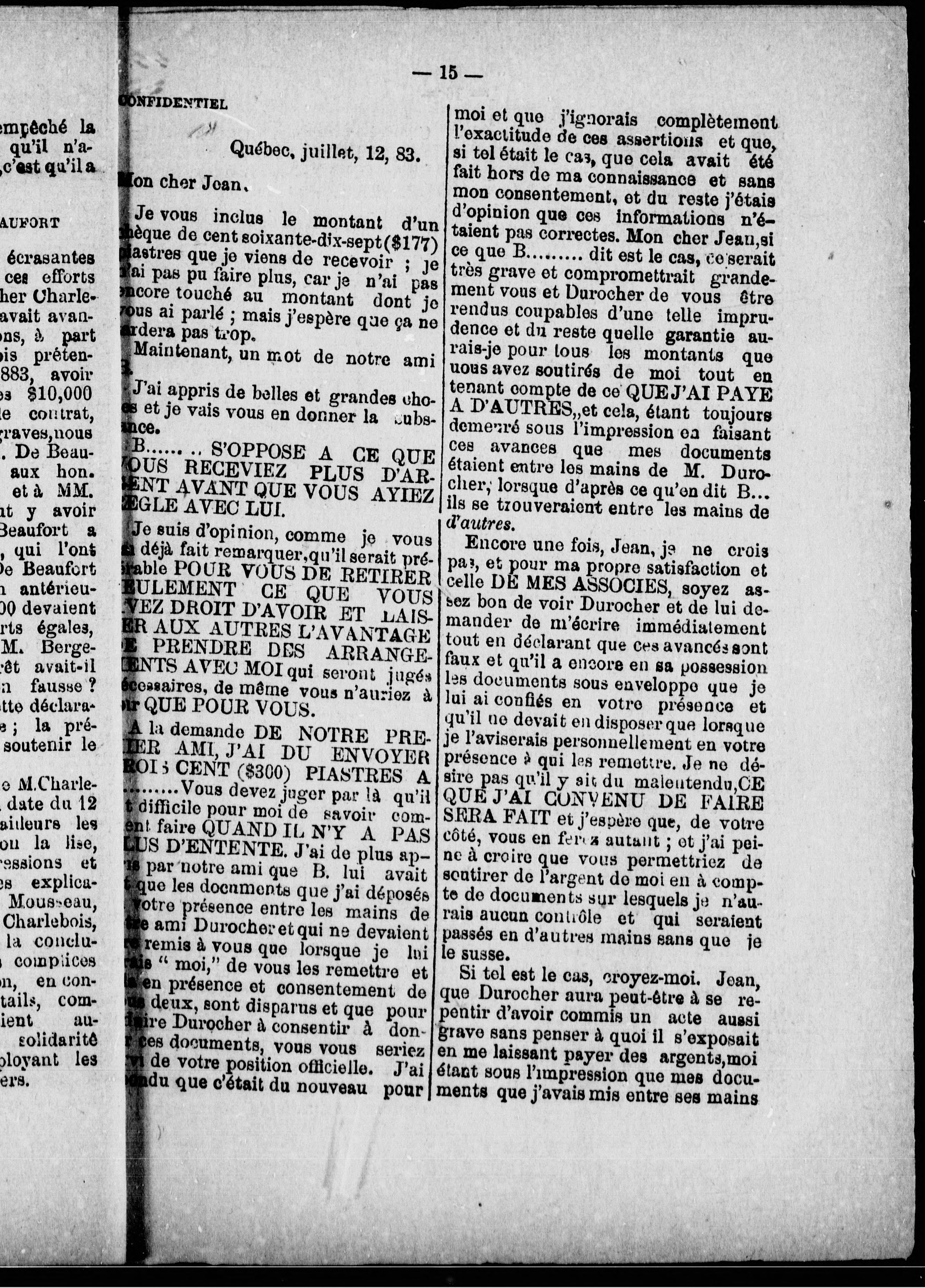 "L'accussation--Le Contrat--Lettres et dépêches--Les [rep]orts des Commissaires Conservateurs pour empêcher la preuve--Résignation de MM. Joly et Robidoux--Etat de sommes payés par le gouvernement à Charlebois pour ameublement de la salle provisoire du Parlement mis en regard de l'état du coût réel de cet ameublement--Les Commissaires ferment la bouche des témoins et Charlebois ferme les portes."