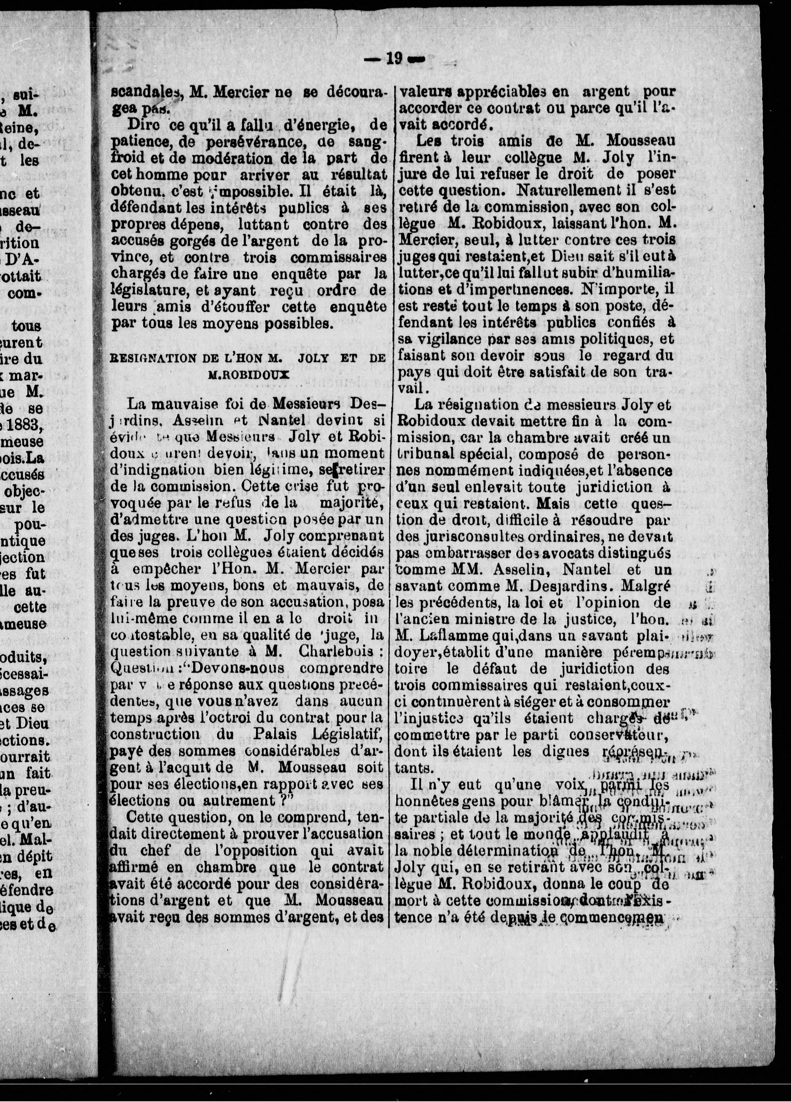 "L'accussation--Le Contrat--Lettres et dépêches--Les [rep]orts des Commissaires Conservateurs pour empêcher la preuve--Résignation de MM. Joly et Robidoux--Etat de sommes payés par le gouvernement à Charlebois pour ameublement de la salle provisoire du Parlement mis en regard de l'état du coût réel de cet ameublement--Les Commissaires ferment la bouche des témoins et Charlebois ferme les portes."