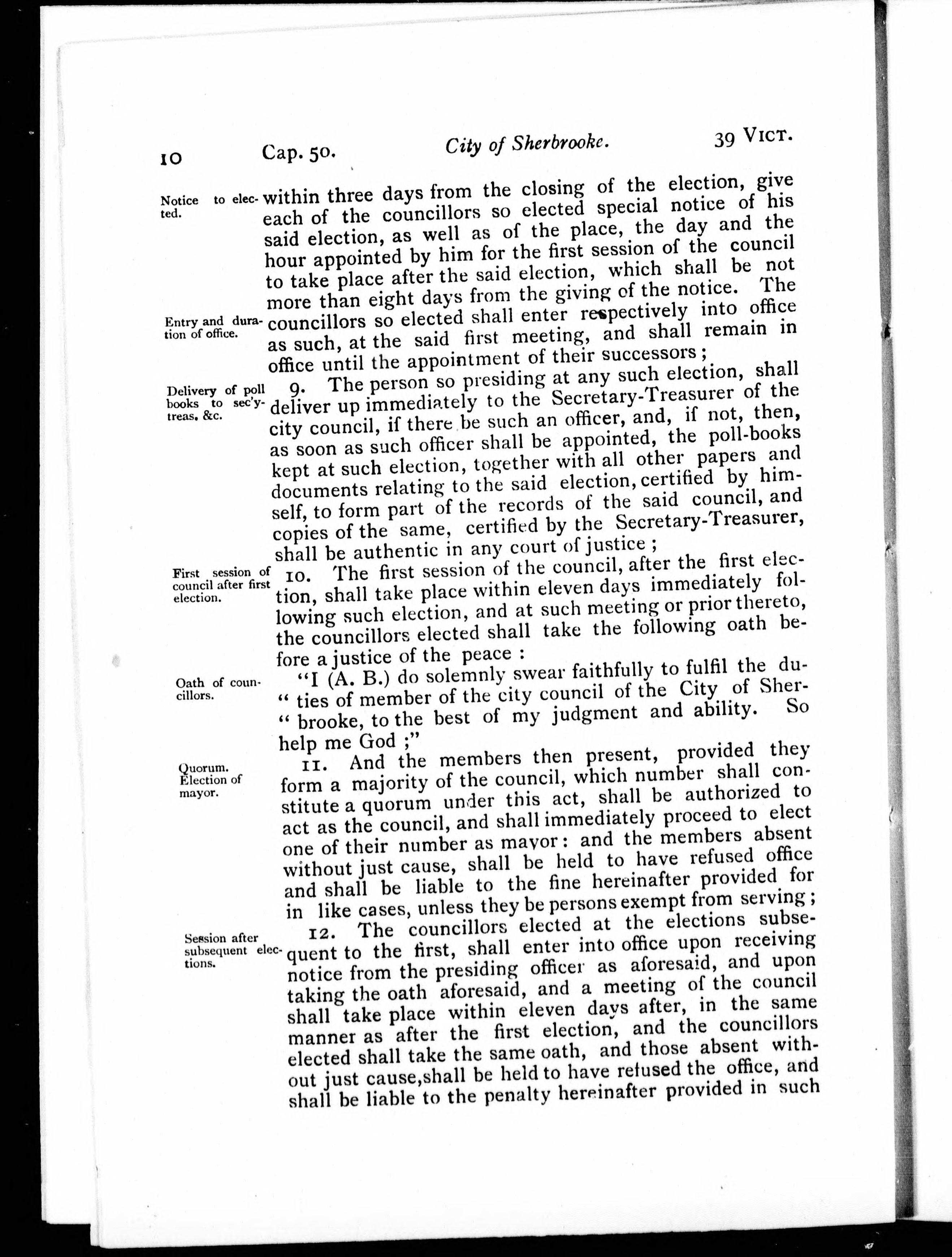 Act of incorporation of the city of Sherbrooke, and amendments.