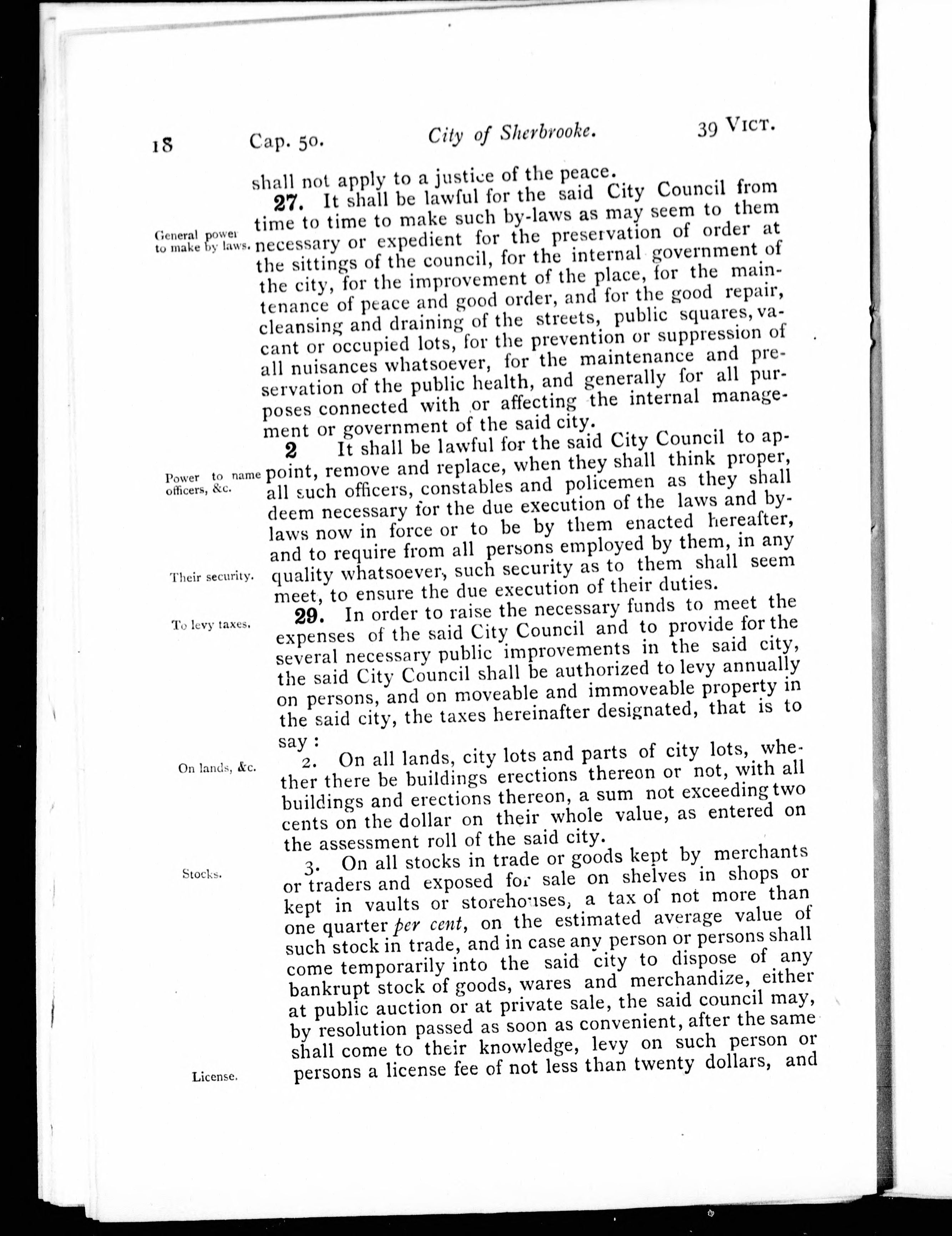 Act of incorporation of the city of Sherbrooke, and amendments.