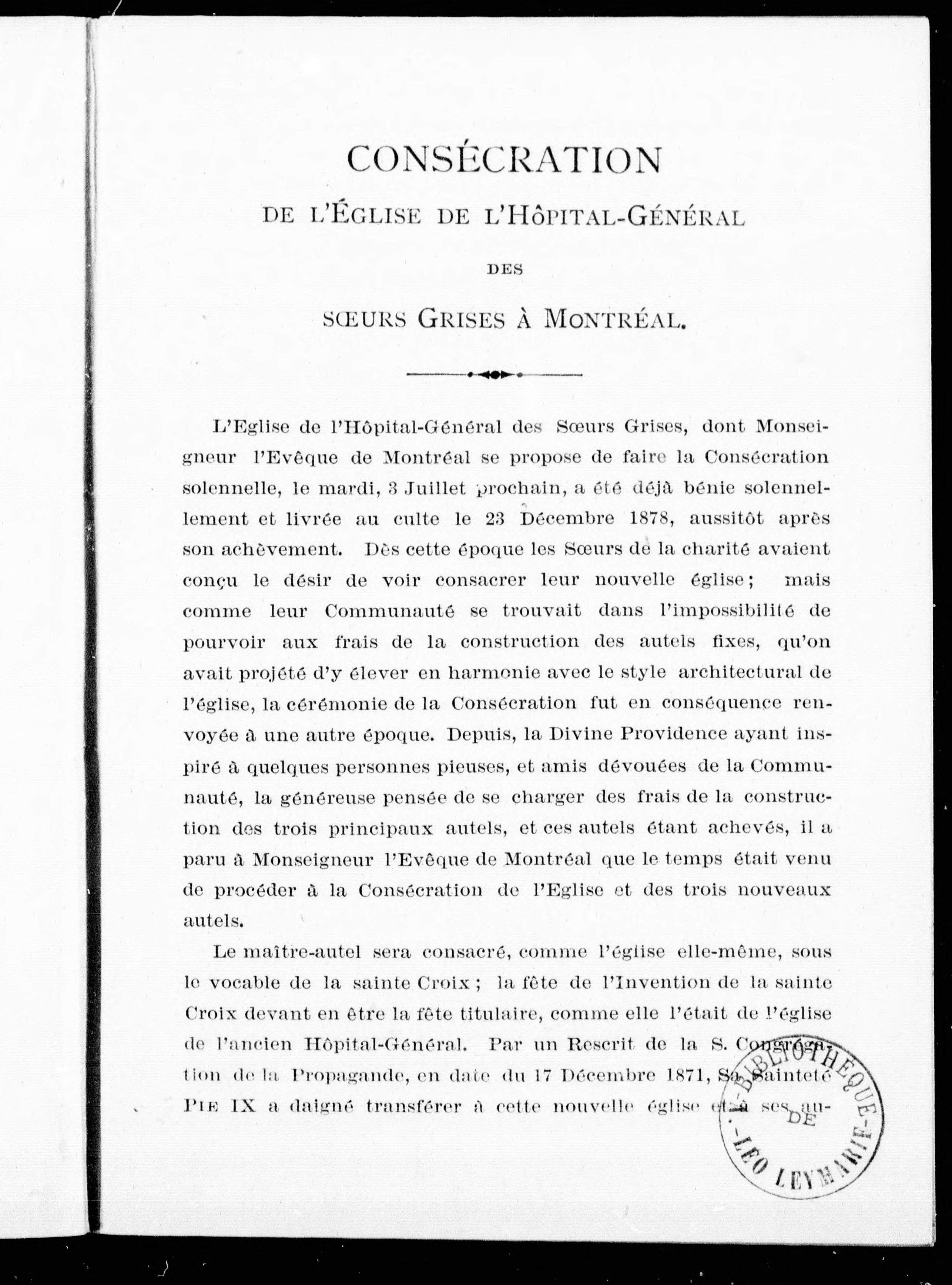 - Consécration de l'église de l'Hôpital-général des Soeurs grises à Montréal, le 3 juillet, 1883