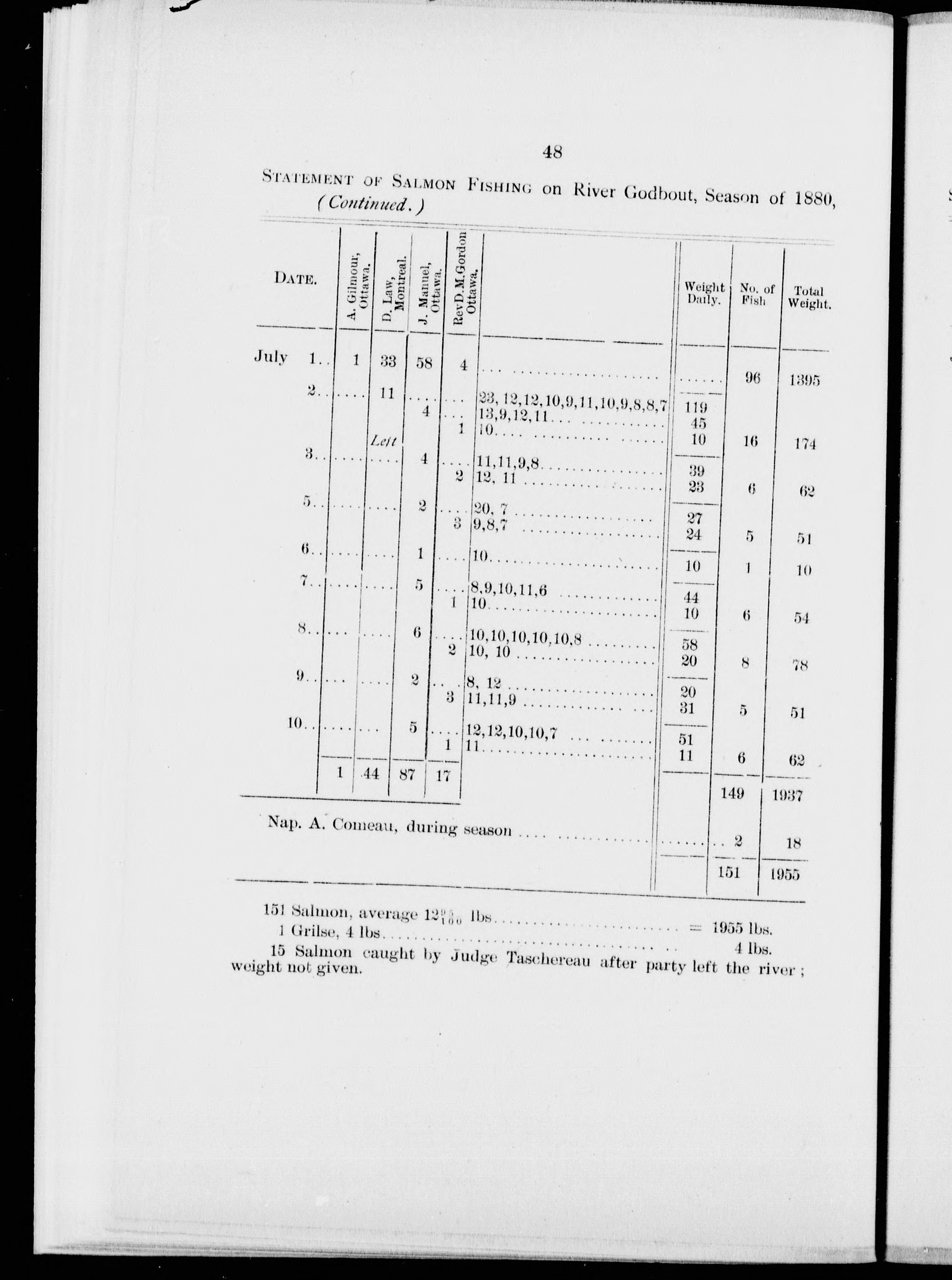 - Statement of salmon fishing on the River Godbout from season 1859, onwards.