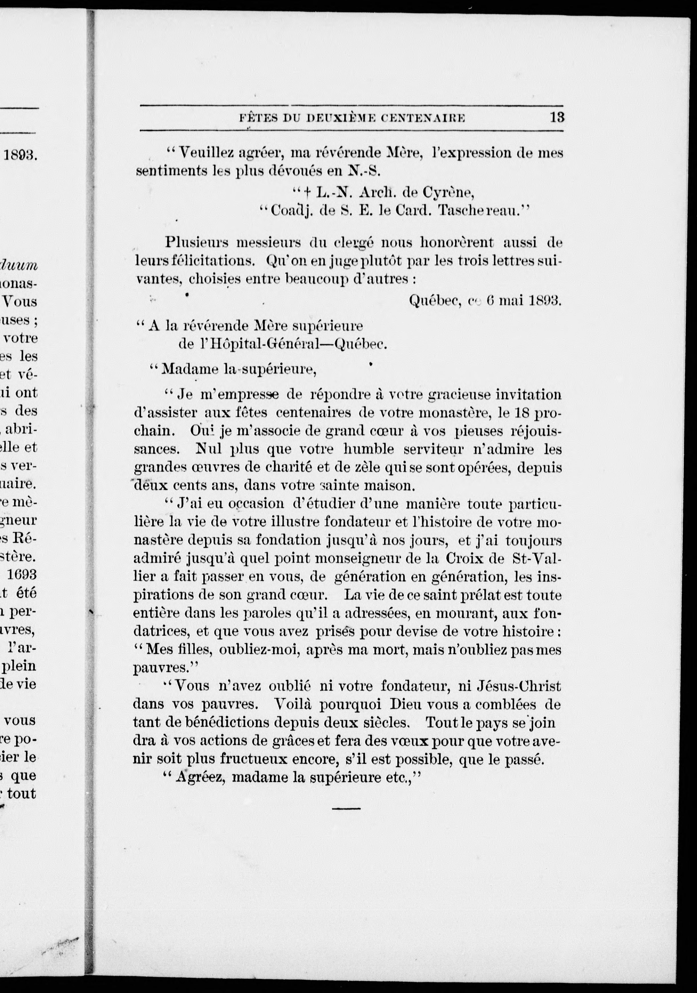 Souvenir des fêtes du second centenaire de la fondation de l'Hôpital-Général de Québec, célébrées au monastère, le 16, le 17 et le 18 mai 1893.