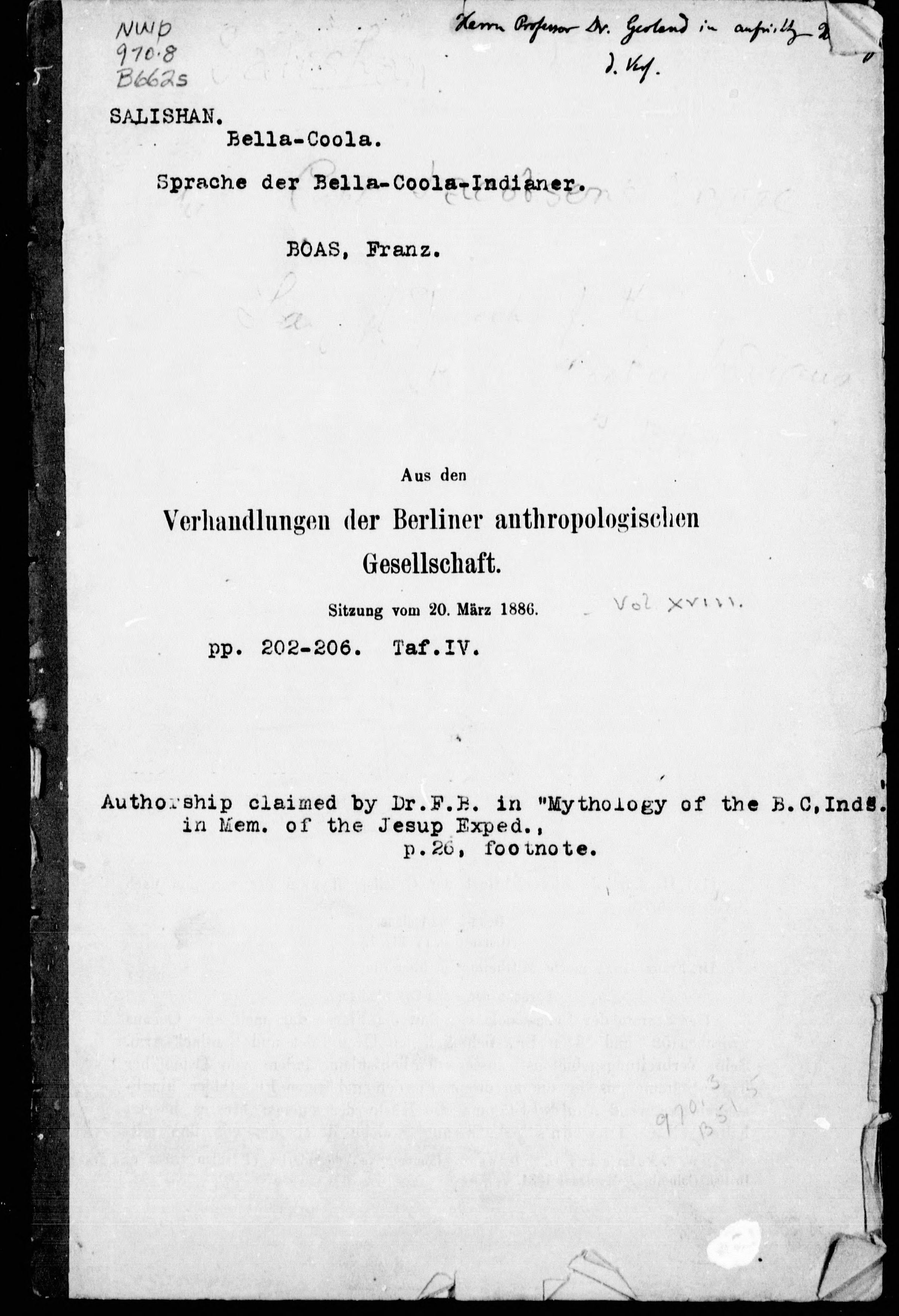 At head of title: Hr. Franz Boas macht Mittheilungen über die [Sprache der Bella-Coola-Indianer].