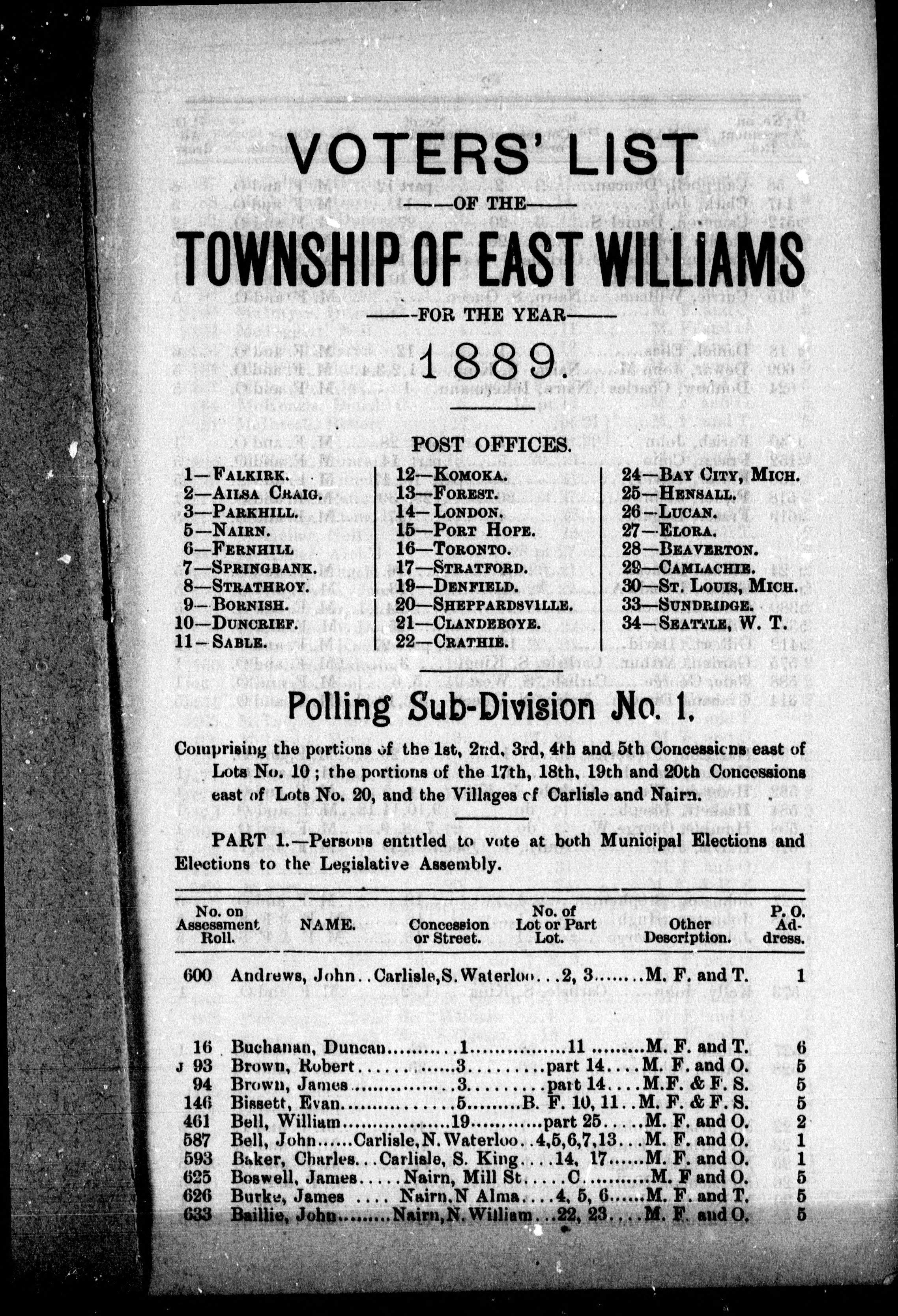 Signed and dated: David Wyllie, clerk of the aforesaid municipality of East Williams, Nairn, P.O., ... 8th day of July, 1889.