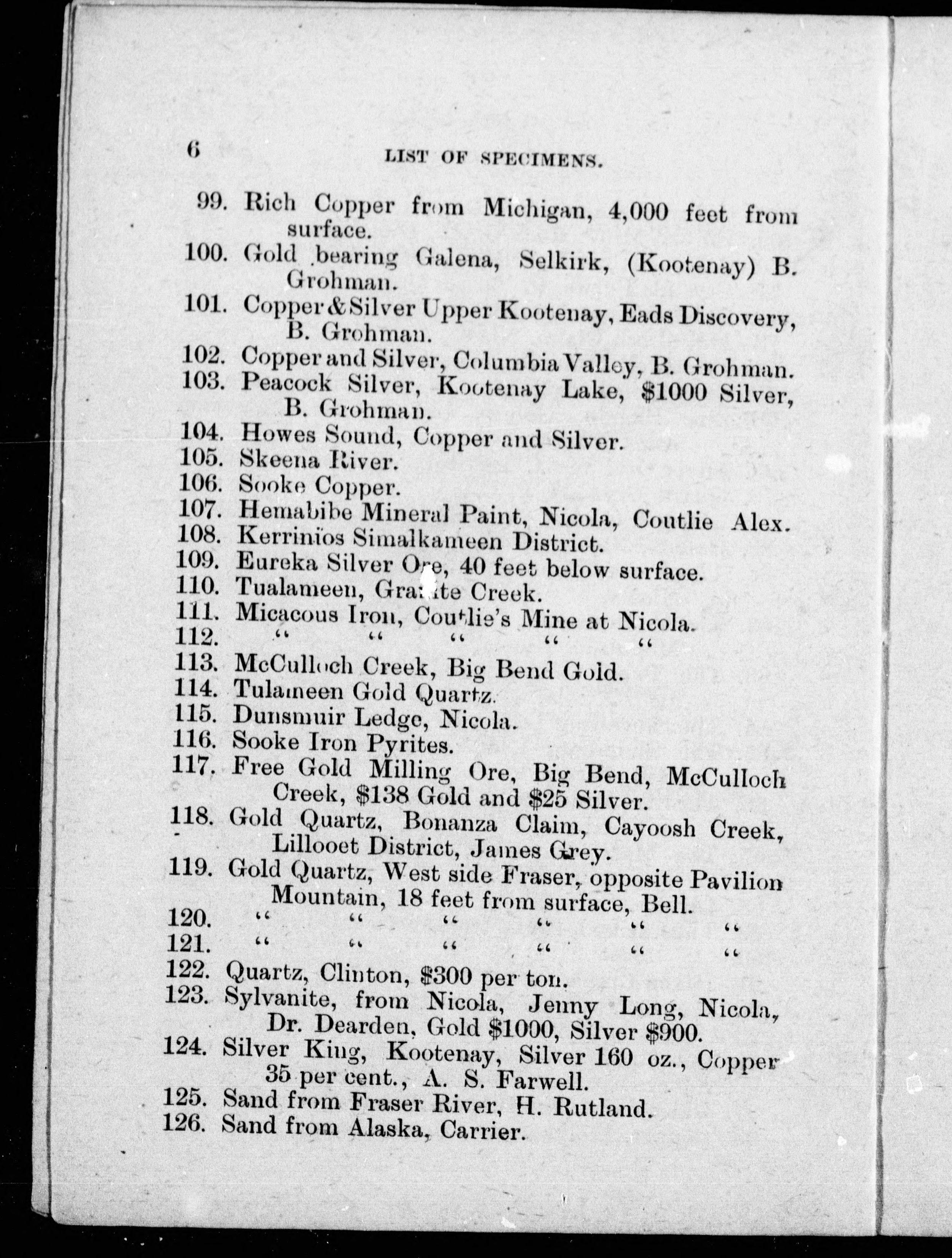 Catalogue of British Columbia minerals as exhibited in specimen case at Kurtz & Co's cigar store, corner Government and Trounce Streets, Victoria, B.C..