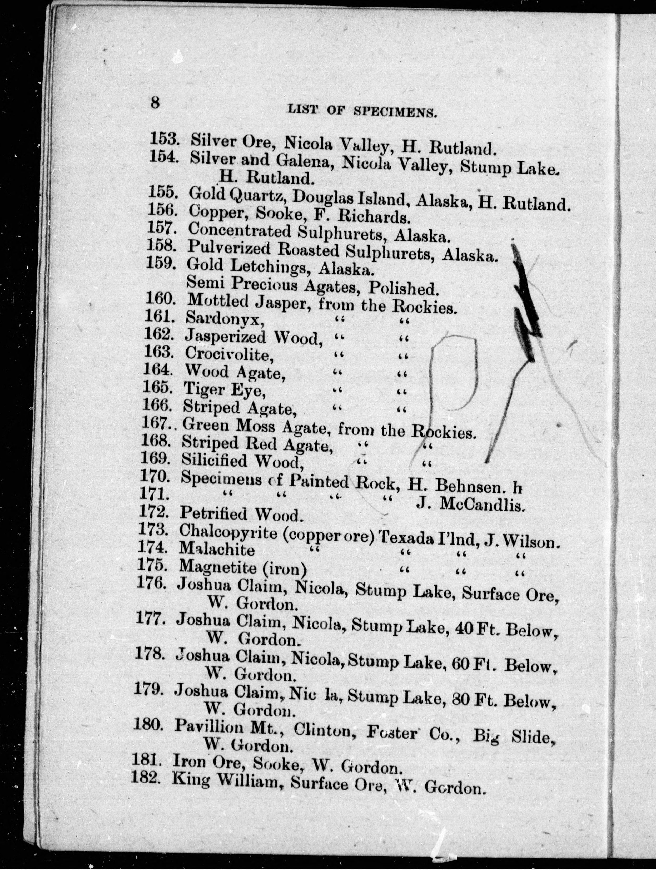 - Catalogue of British Columbia minerals as exhibited in specimen case at Kurtz & Co's cigar store, corner Government and Trounce Streets, Victoria, B.C..