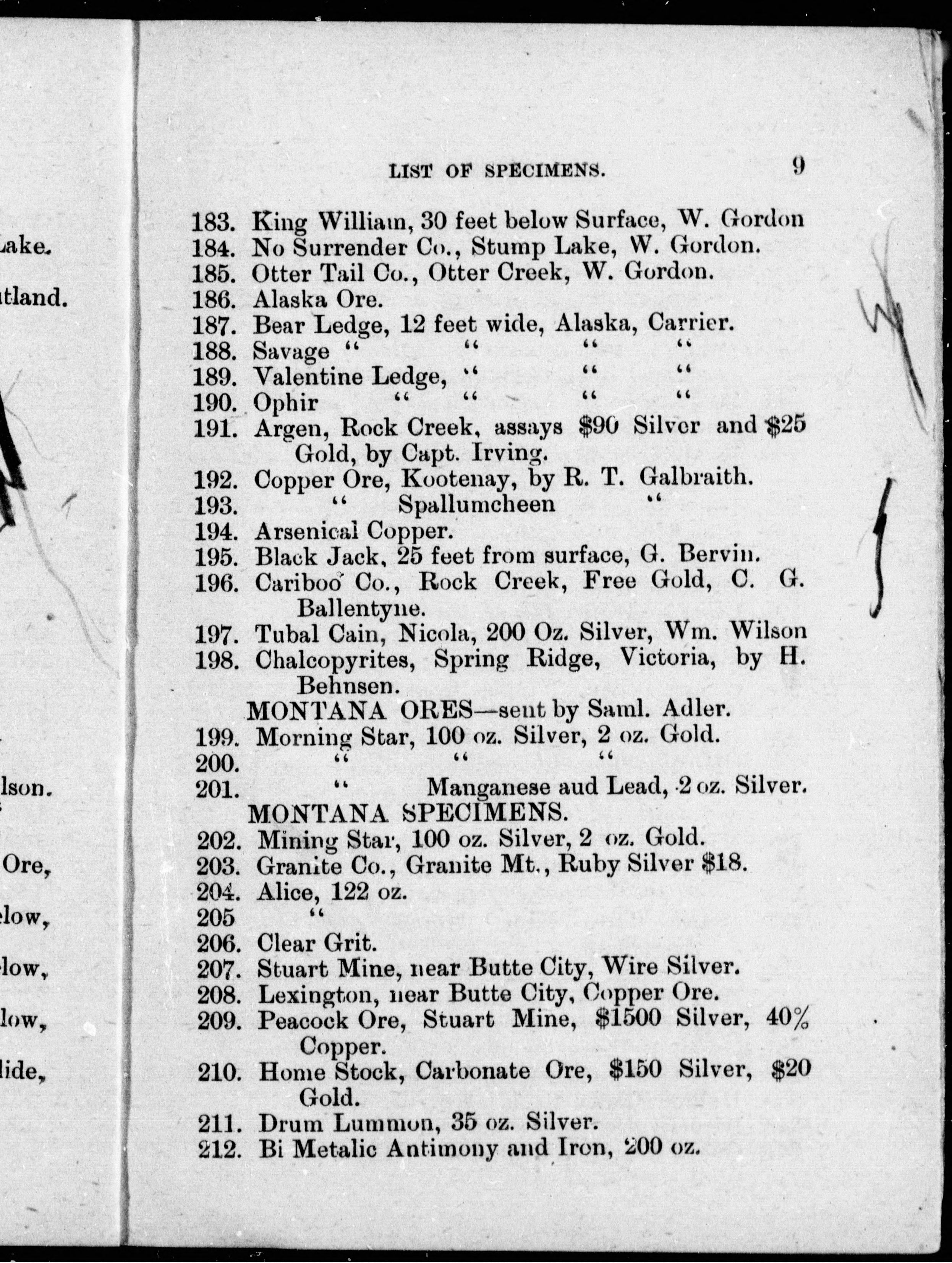 Catalogue of British Columbia minerals as exhibited in specimen case at Kurtz & Co's cigar store, corner Government and Trounce Streets, Victoria, B.C..