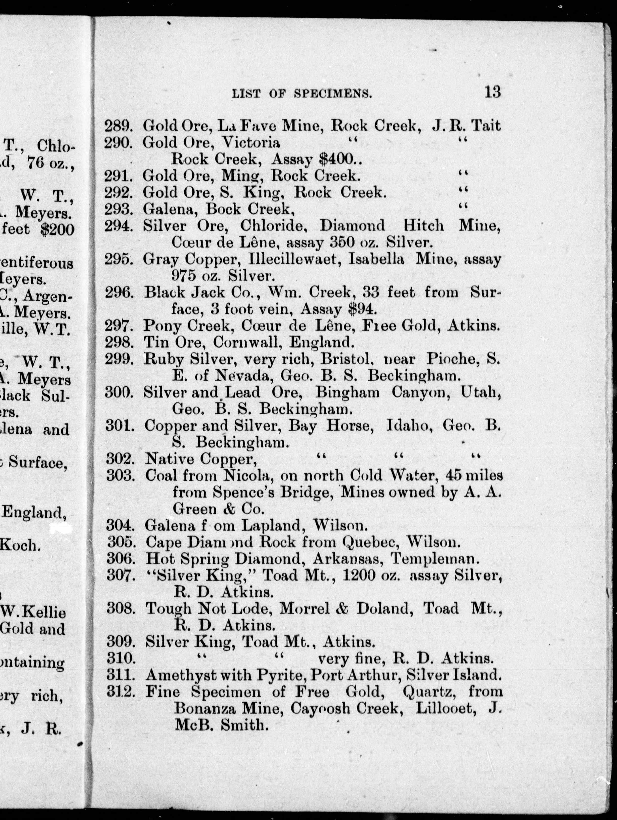 Catalogue of British Columbia minerals as exhibited in specimen case at Kurtz & Co's cigar store, corner Government and Trounce Streets, Victoria, B.C..