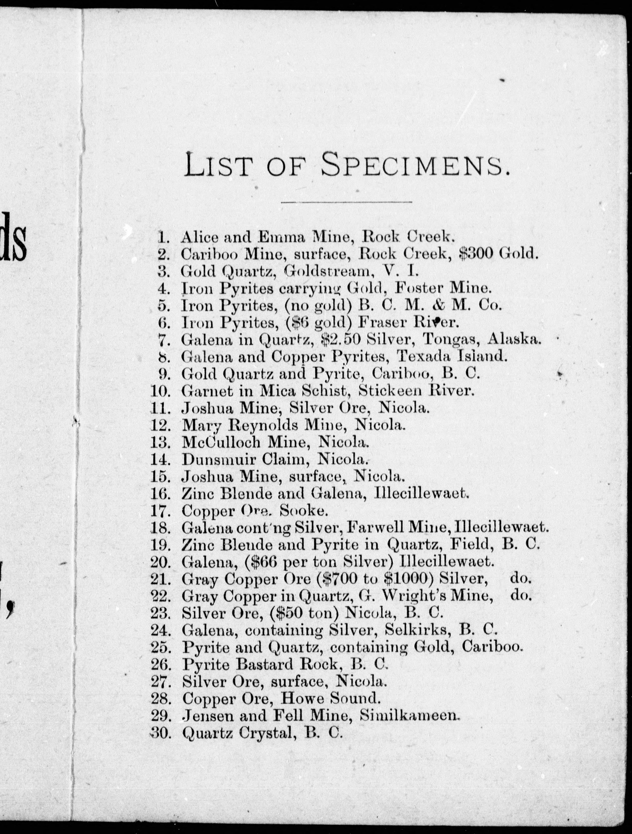 Catalogue of British Columbia minerals as exhibited in specimen case at Kurtz & Co's cigar store, corner Government and Trounce Streets, Victoria, B.C..