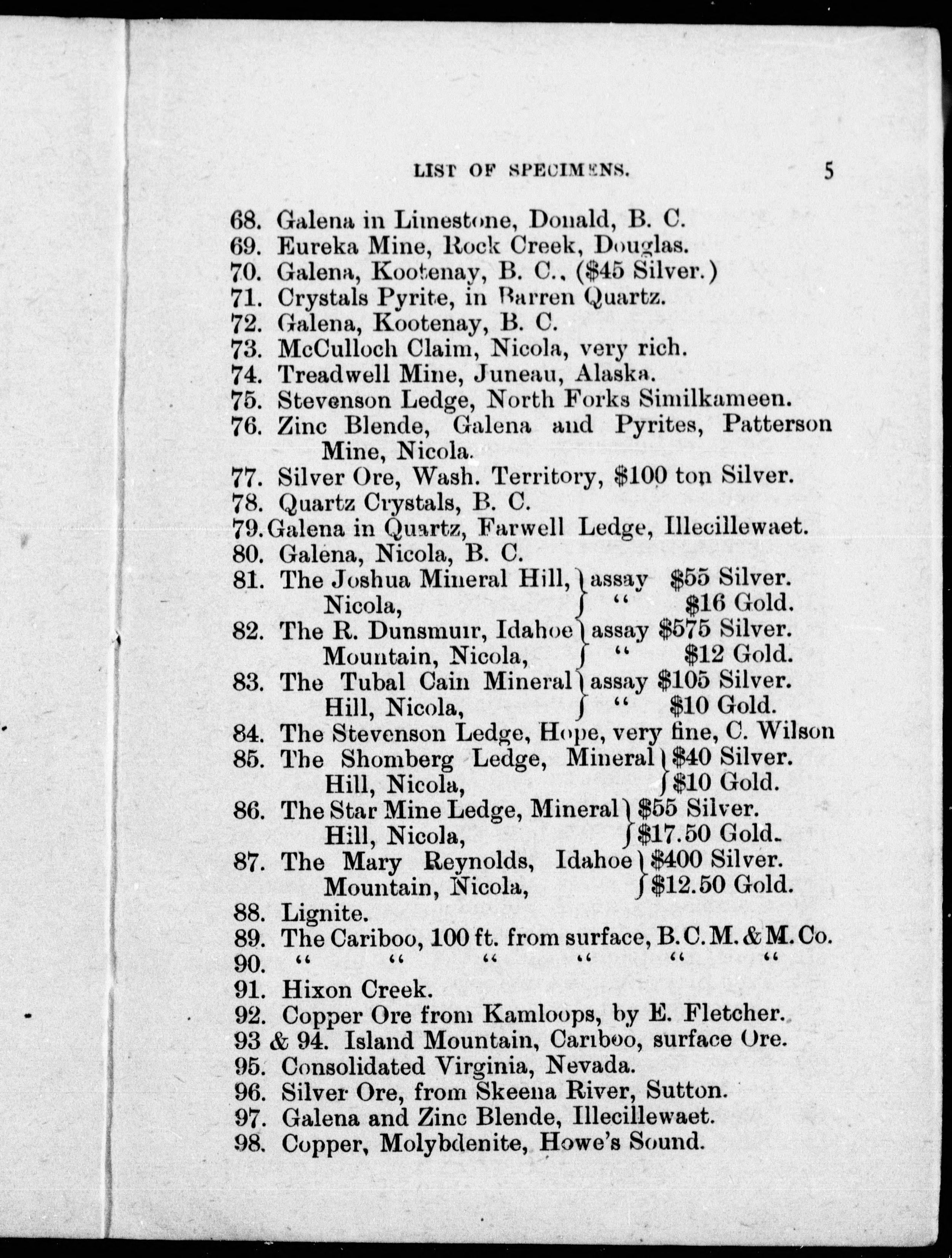 Catalogue of British Columbia minerals as exhibited in specimen case at Kurtz & Co's cigar store, corner Government and Trounce Streets, Victoria, B.C..