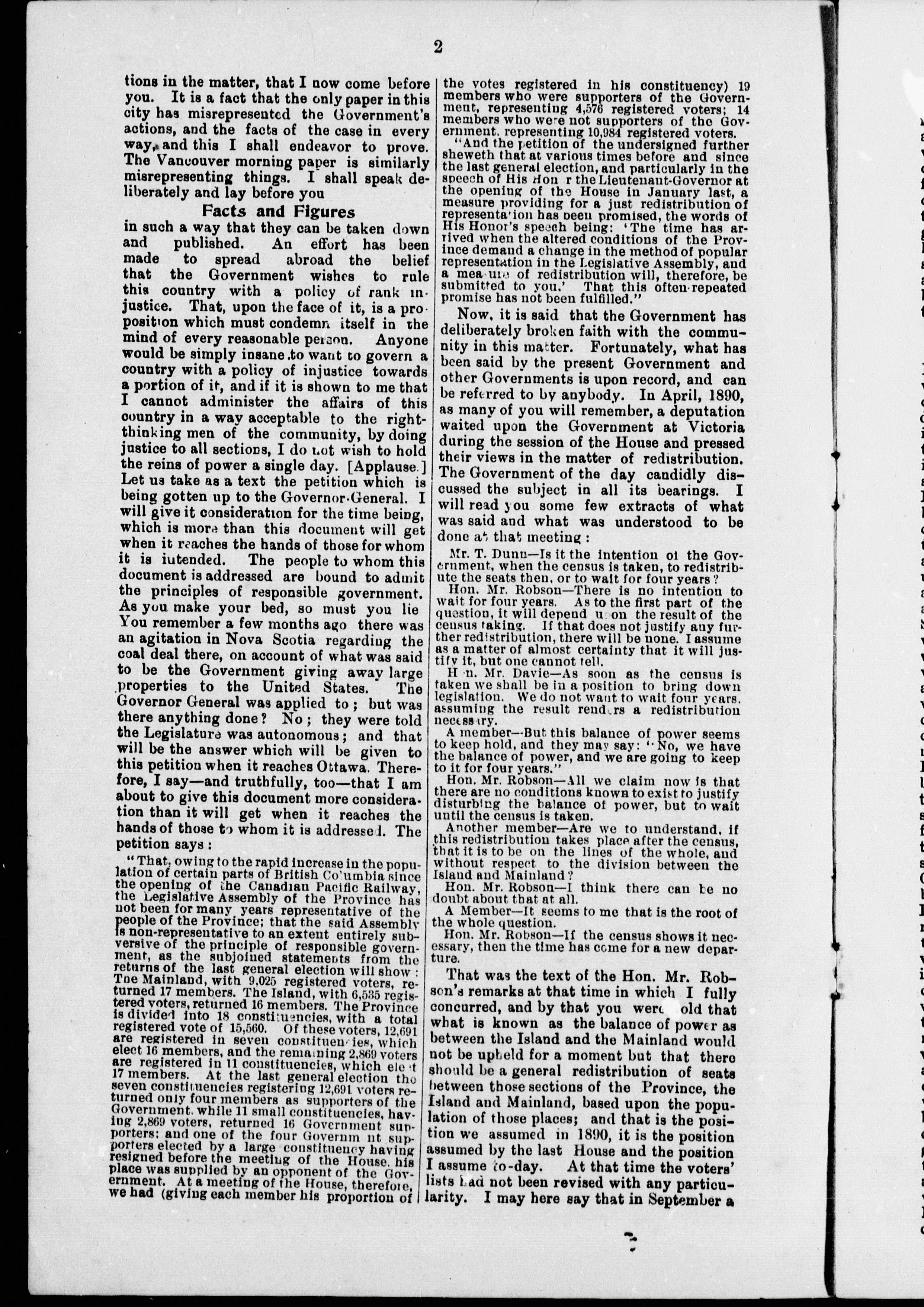 - Facts and figures : mass meeting addressed by the premier at New Westminster : equal justice by the administration to all sections of the province alike clearly proved, Parliament Buildings and redistribution policy of the government triumphantly vindicated.