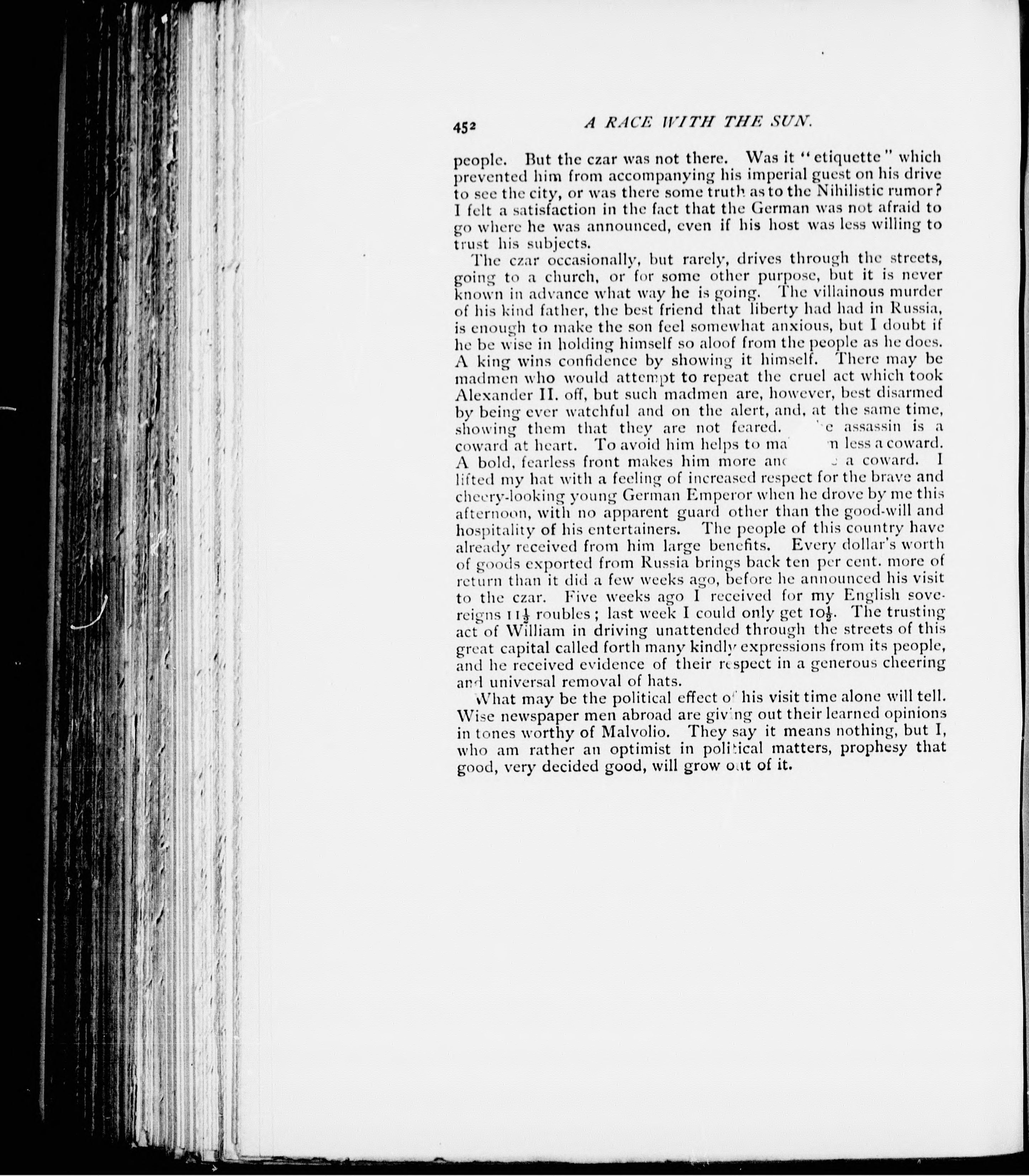 A race with the sun, or, A sixteen months' tour from Chicago around the world : through Manitoba and British Columbia by the Canadian Pacific, Oregon, and Washington, Japan, China, Siam, Straits Settlements, Burmah, India, Ceylon, Egypt, Greece, Turkey, Roumania, Hungary, Austria, Poland, Transcaucasia, the Caspian Sea and the Volga River, Russia, Finland, Sweden, Norway, Denmark, Prussia, Paris, London and home