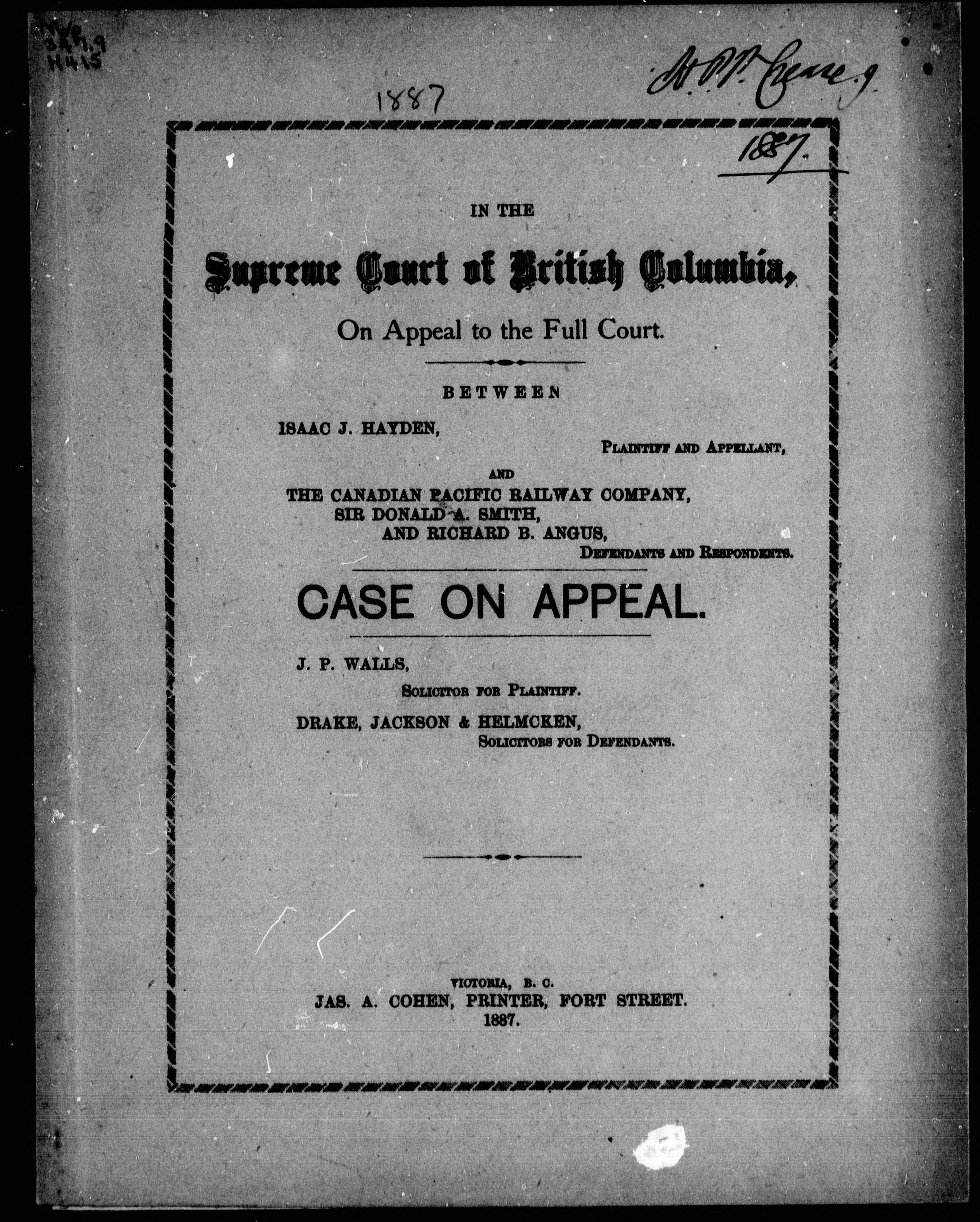 - In the Supreme Court of British Columbia, on appeal to the full court : between Isaac J. Hayden, plaintiff and appellant, and the Canadian Pacific Railway Company, Sir Donald A. Smith and Richard B. Angus, defendants and respondents : case on appeal : J.P. Walls, solicitor for plaintiff, Drake, Jackson & Helmcken, solicitors for defendants.