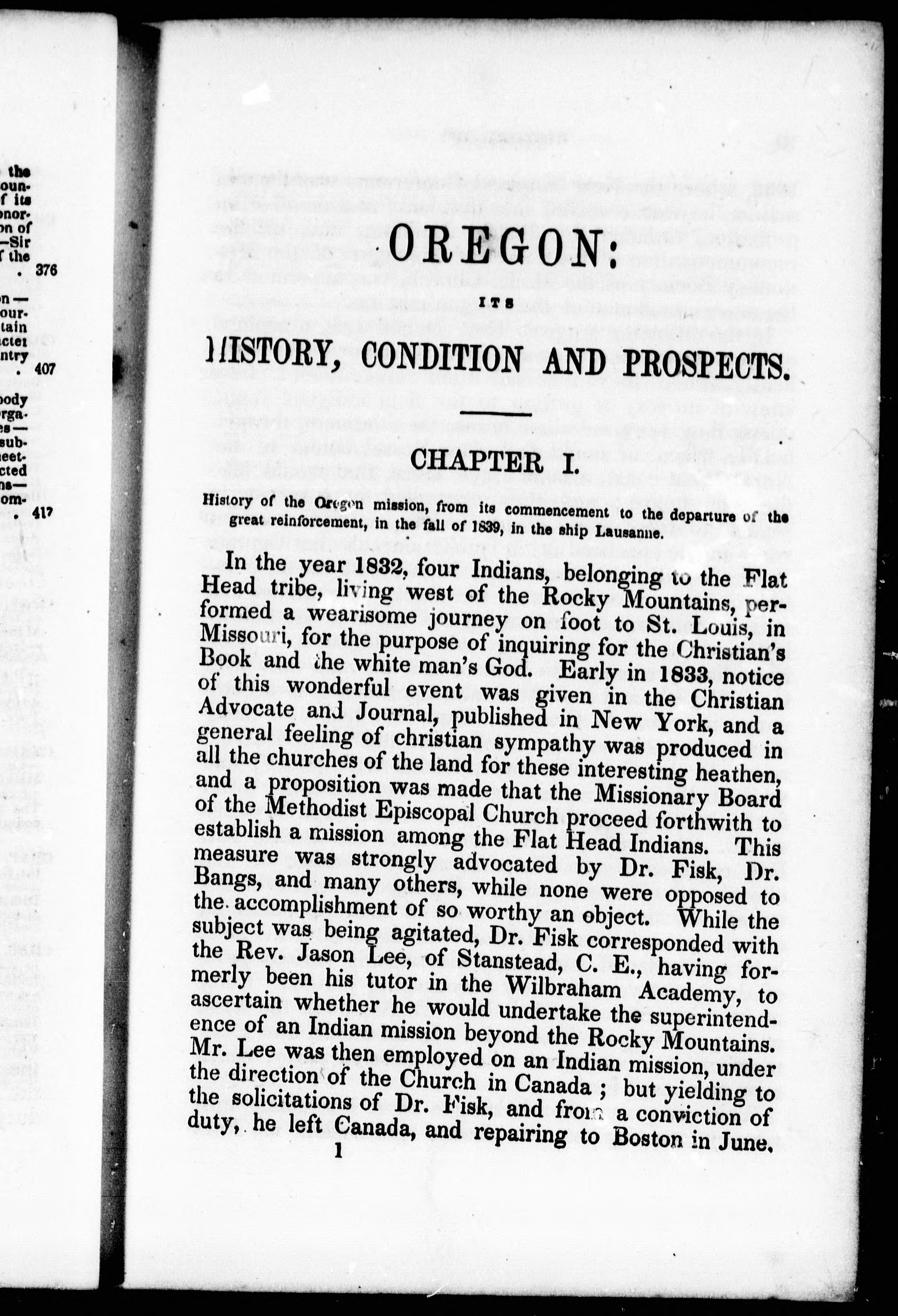 Oregon, its history, condition and prospects : containing a description of the geography, climate and productions, with personal adventures among the Indians during a residence of the author on the plains bordering the Pacific while connected with the Oregon mission; embracing extended notes on a voyage around the world