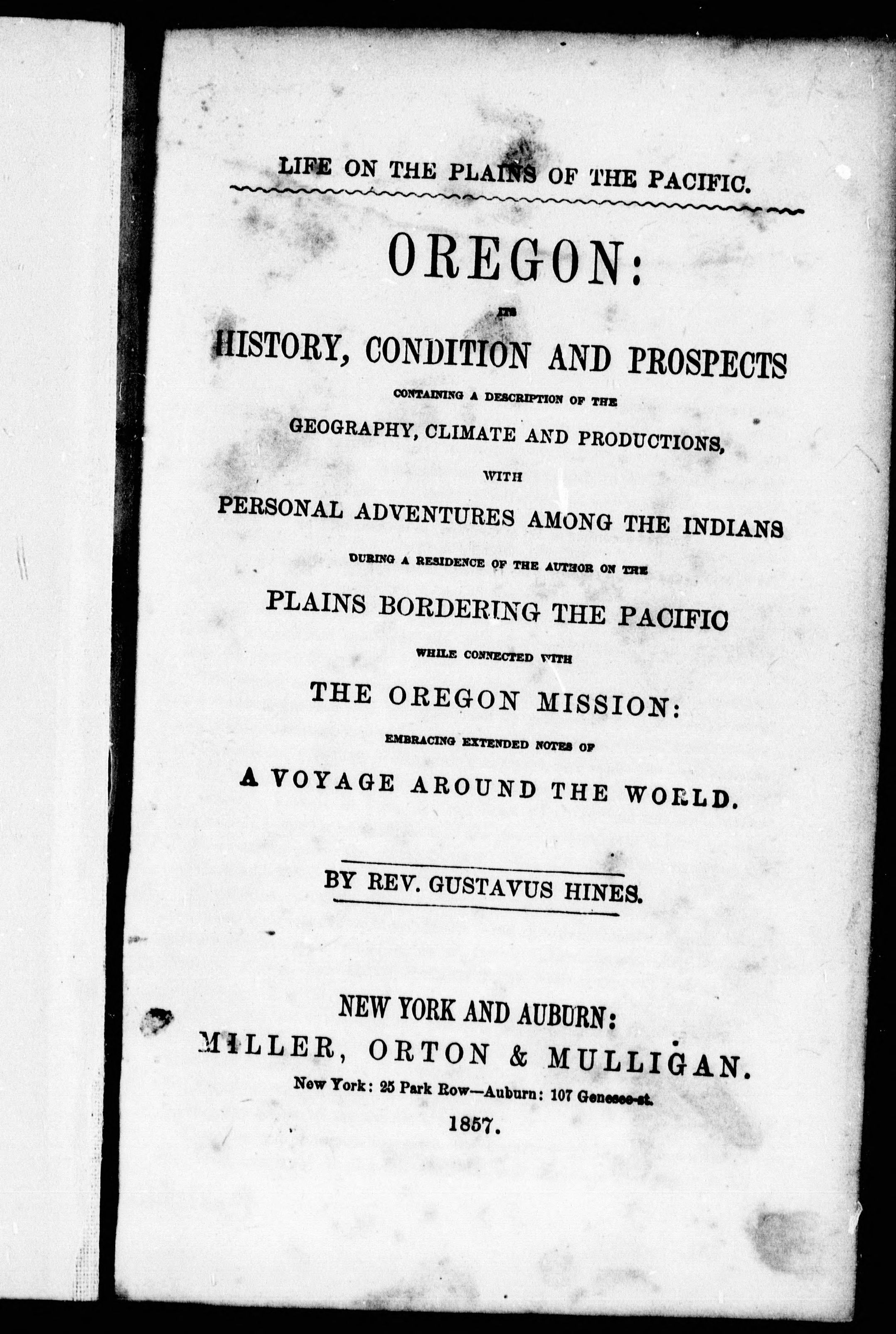 Oregon, its history, condition and prospects : containing a description of the geography, climate and productions, with personal adventures among the Indians during a residence of the author on the plains bordering the Pacific while connected with the Oregon mission; embracing extended notes on a voyage around the world