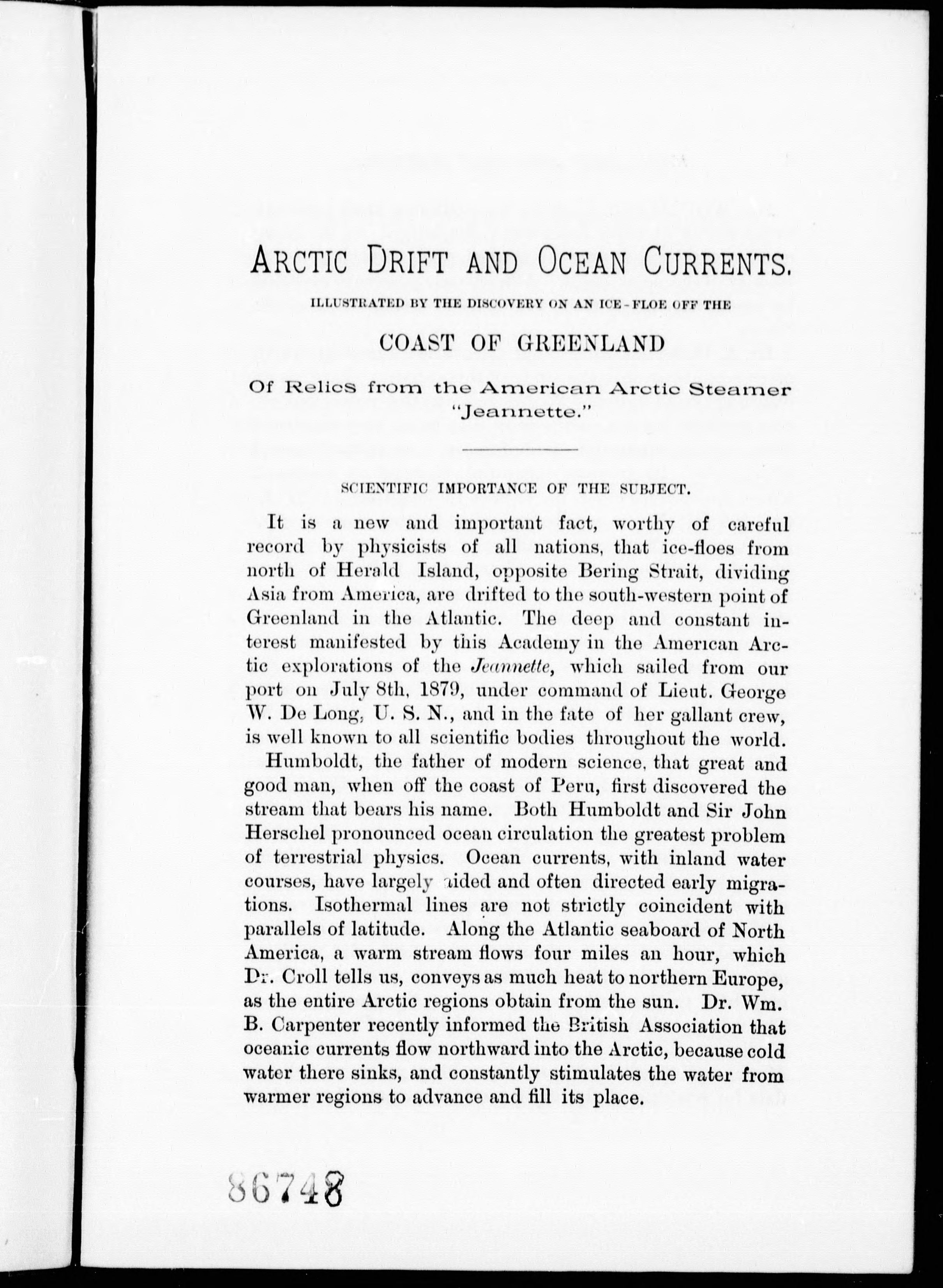 Arctic drift and ocean currents : illustrated by the discovery on an ice-floe off the coast of Greenland of relics from the American Arctic steamer "Jeannette"