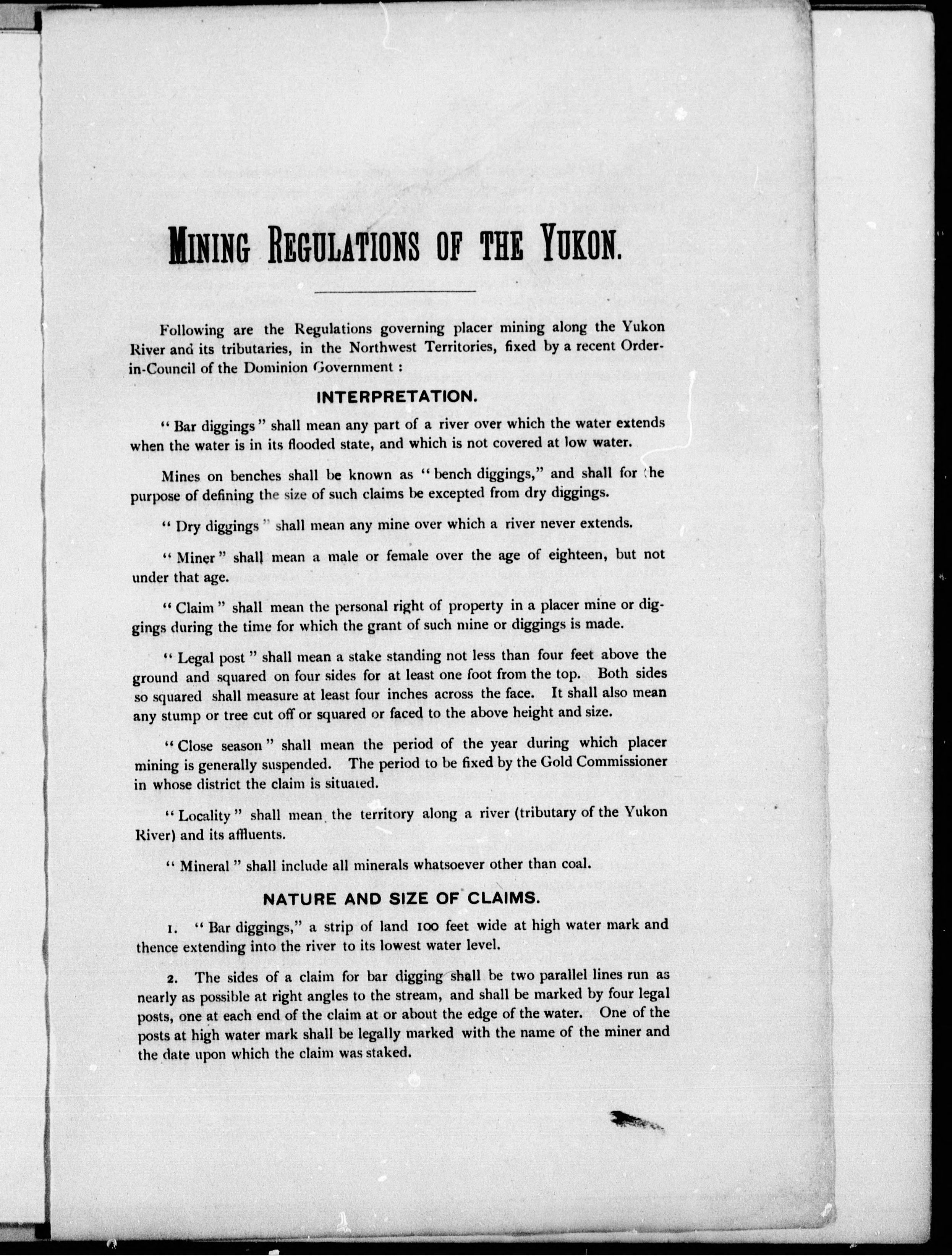 Yukon gold fields : map showing routes from Victoria, B. C. to the various mining camps on the Yukon River and its branches : mining regulations of the Dominion government and forms of application : together with table of distances, extracts from Mr. Ogilvie's reports, and other information