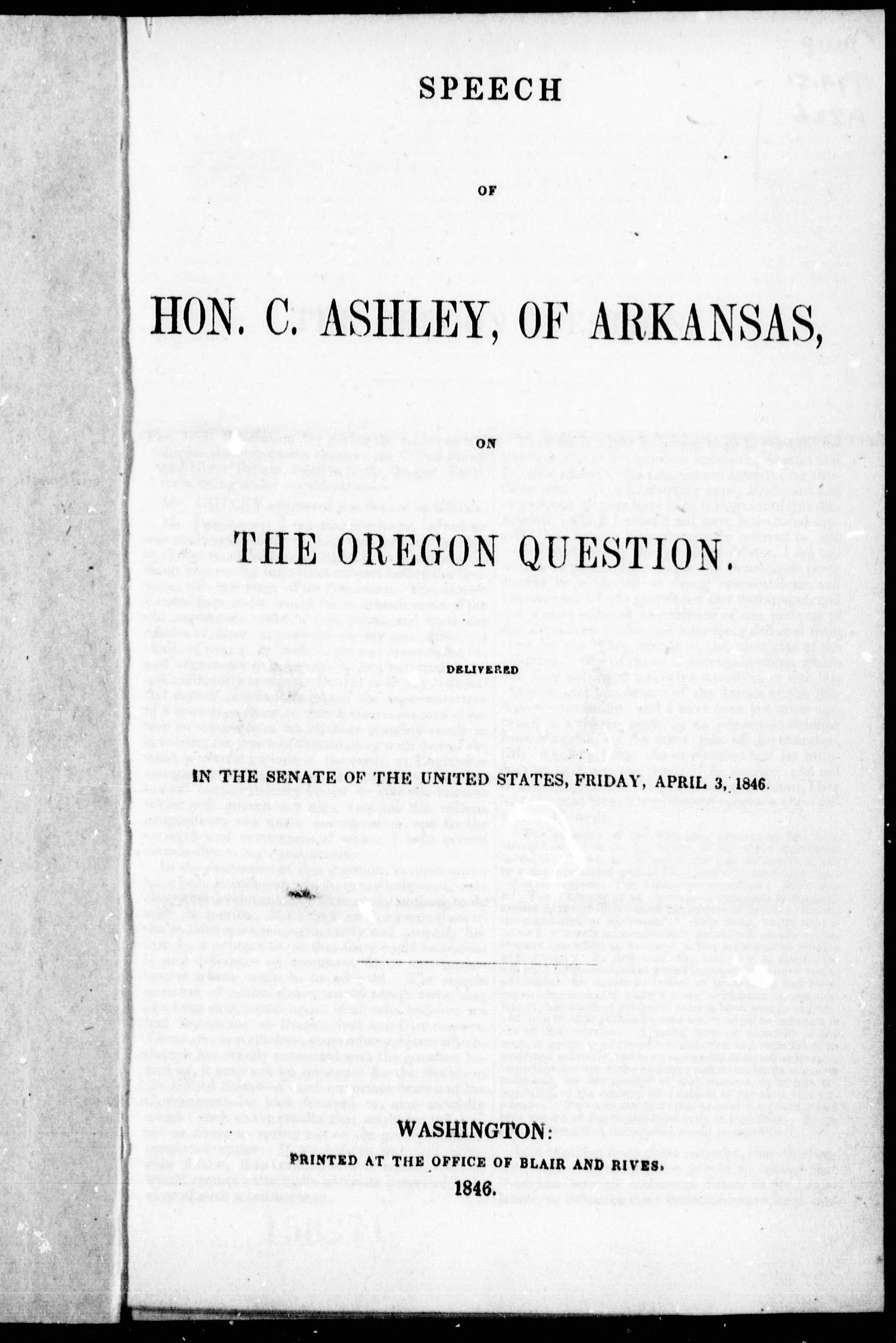 - Speech of Hon. C. Ashley, of Arkansas, on the Oregon question : delivered in the Senate of the United States, Friday, April 3, 1846.
