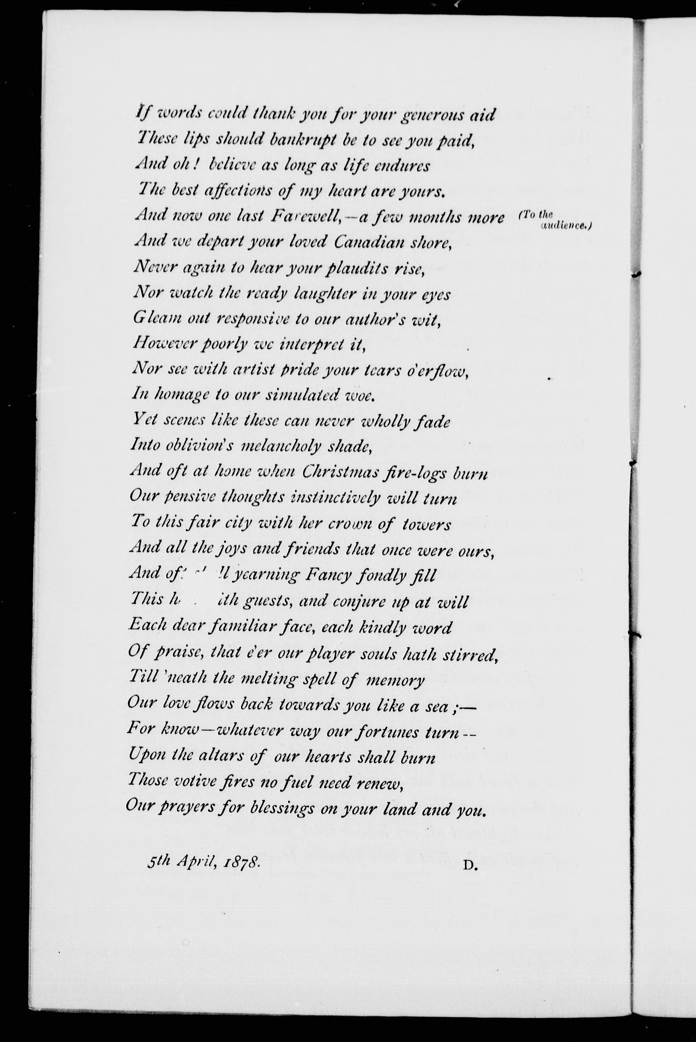 Epilogue spoken by Her Excellency the Countess of Dufferin at the last performance--p. [2-4].