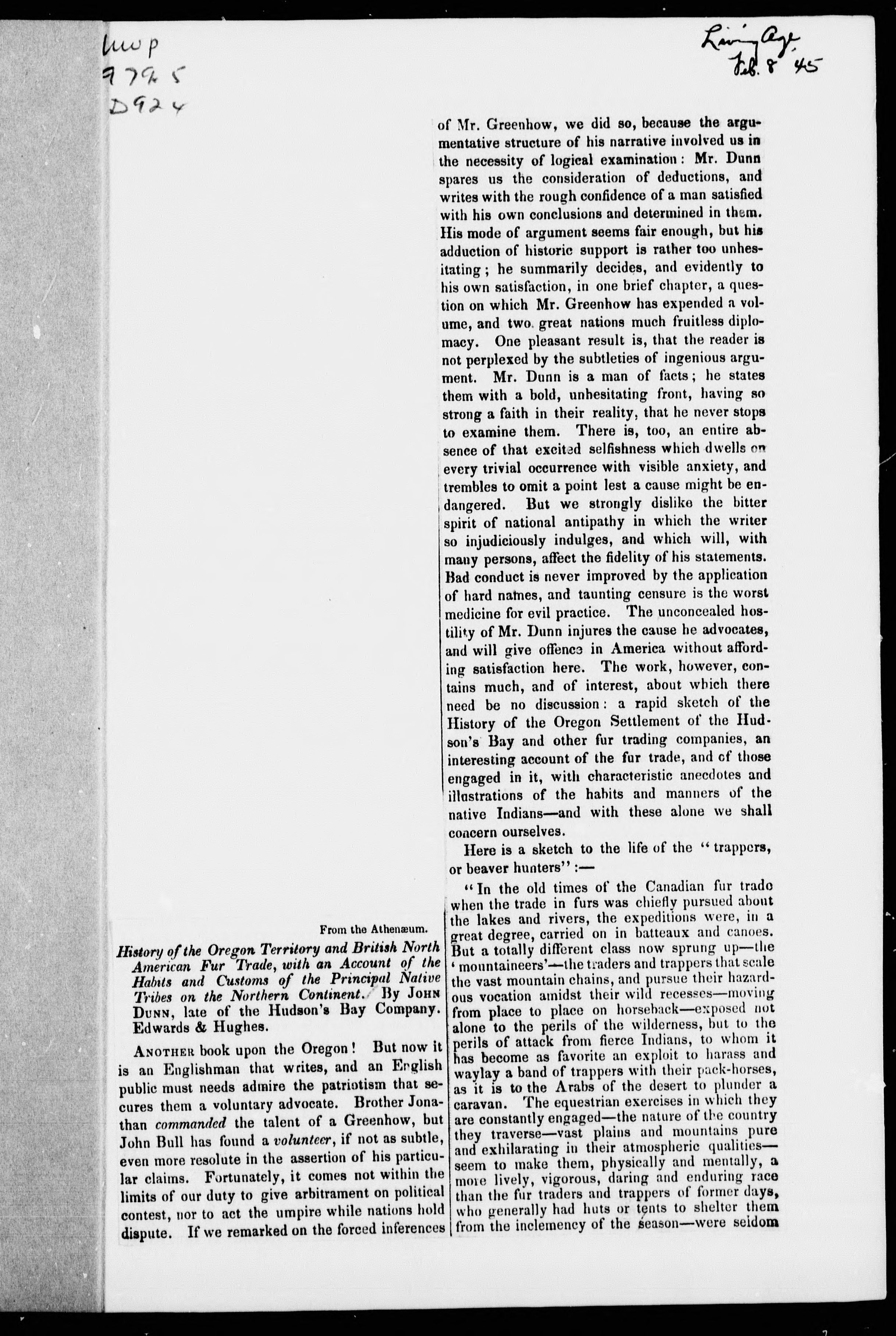 - Dunn, John. History of the Oregon Territory and British North American fur trade.