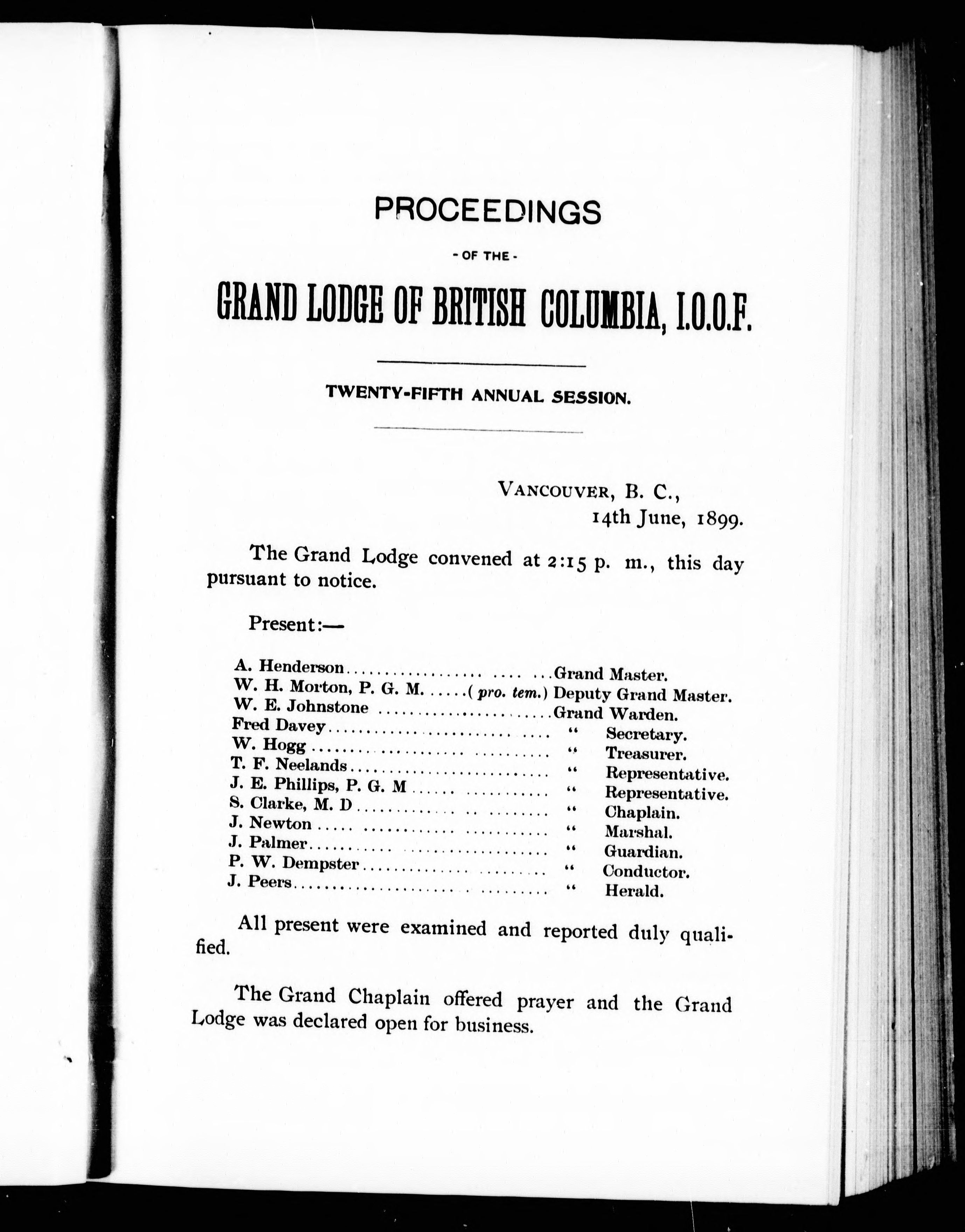 Proceedings of the twenty-fifth annual session of the Grand Lodge of British Columbia of the Independent Order of Odd Fellows : held at Vancouver, B.C., June 14th, 15th and 16th, 1899. - Adresse bibliographique