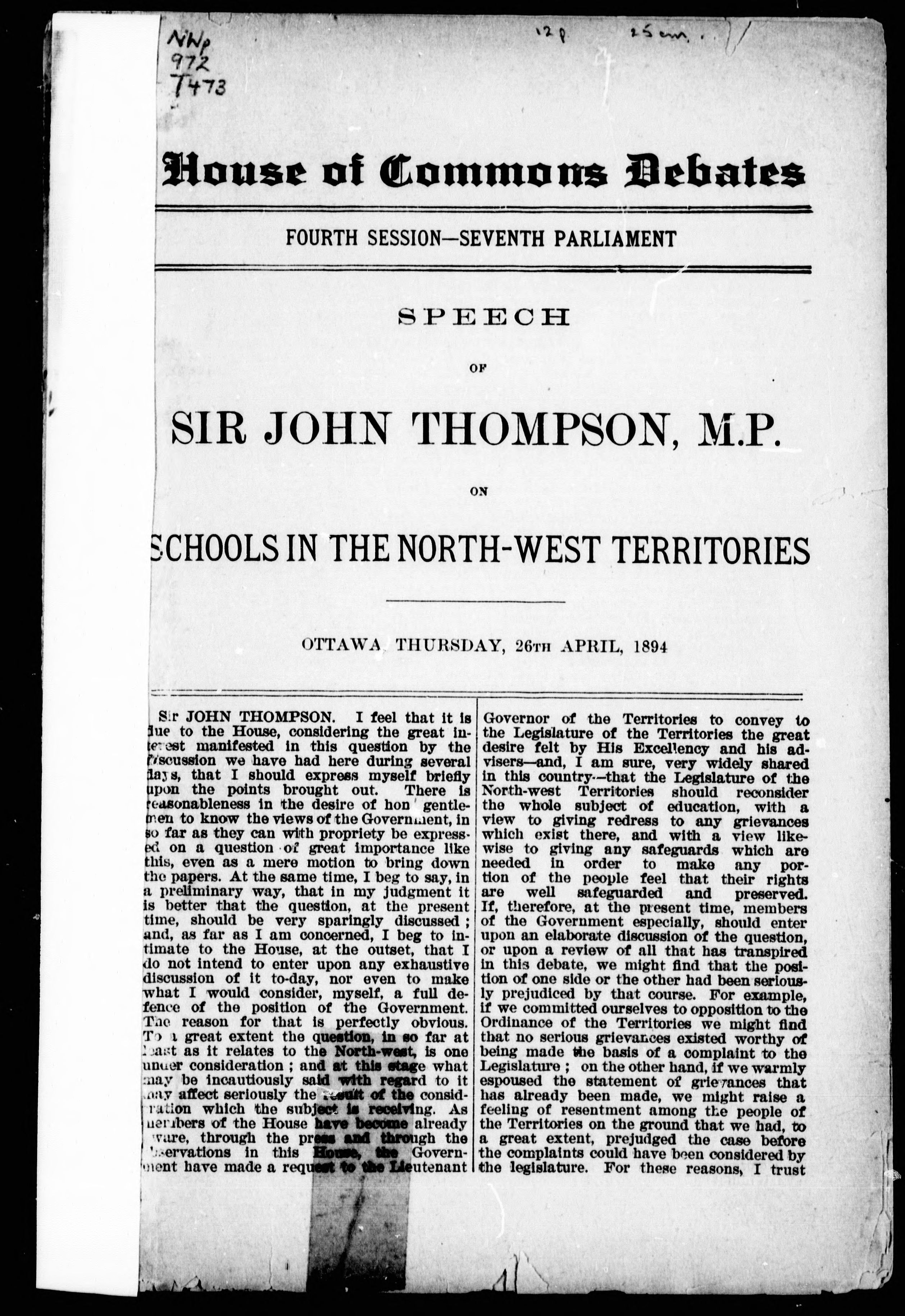 - Speech of Sir John Thompson, M.P. on schools in the North-West Territories.