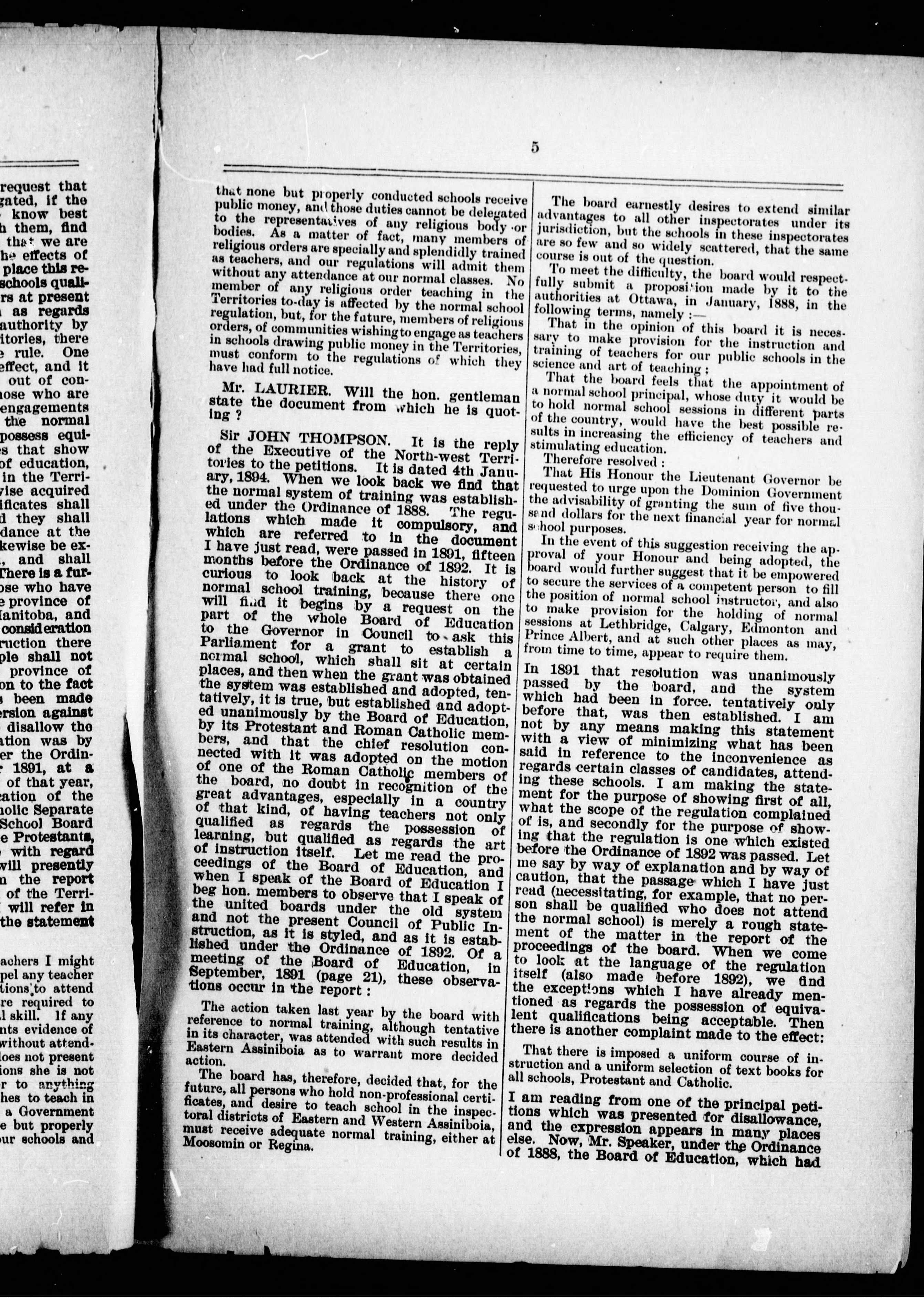 - Speech of Sir John Thompson, M.P. on schools in the North-West Territories.