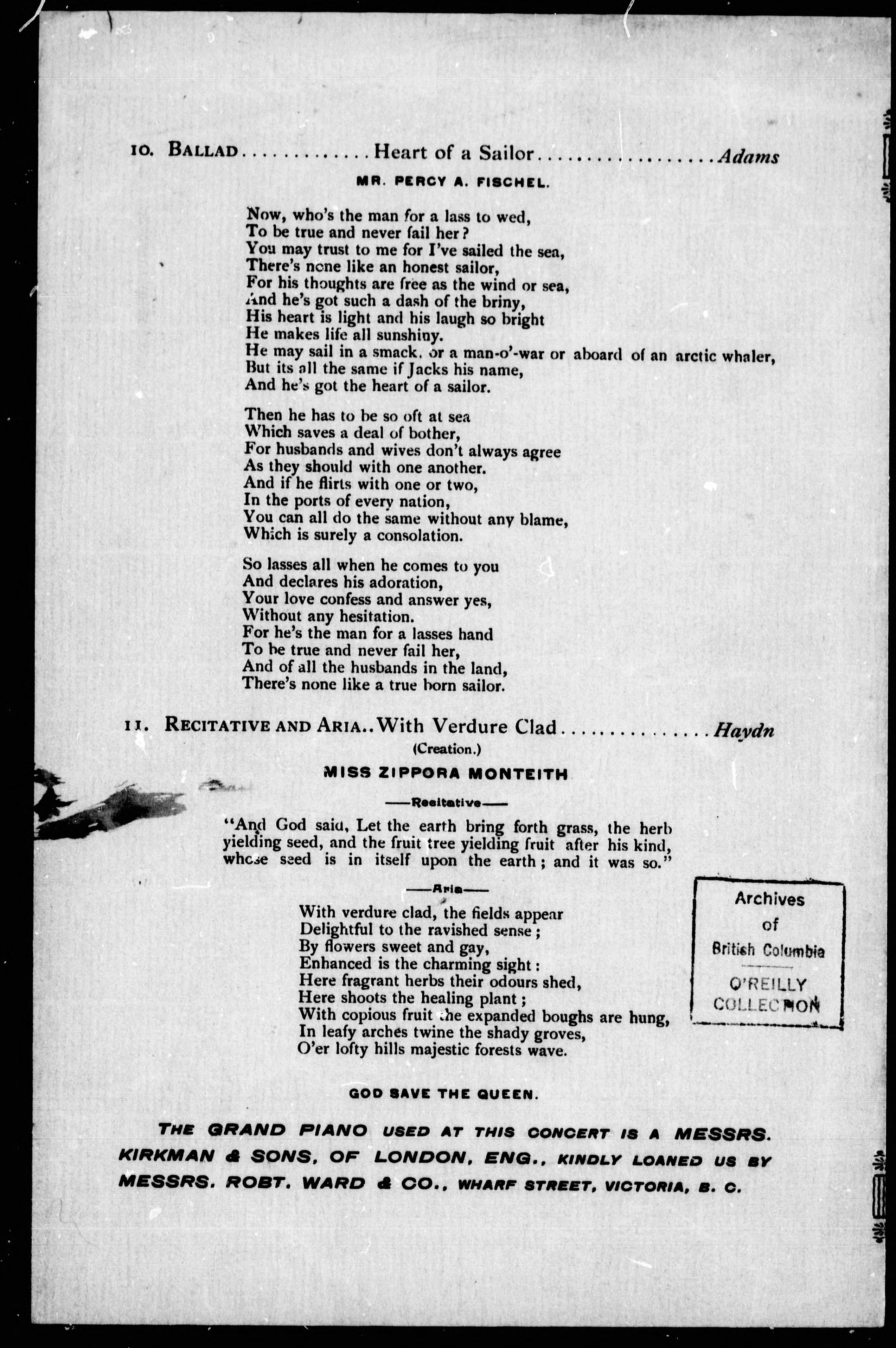 Grand evening concert at Victoria Opera House on Thursday, the 23rd of March, 1893, under the patronage of His Honor the Lieutenant Governor : given by Miss Zippora Monteith, soprano ; Miss Marguerite Saxton, dramatic reciter ... to commence at 8 o'clock.