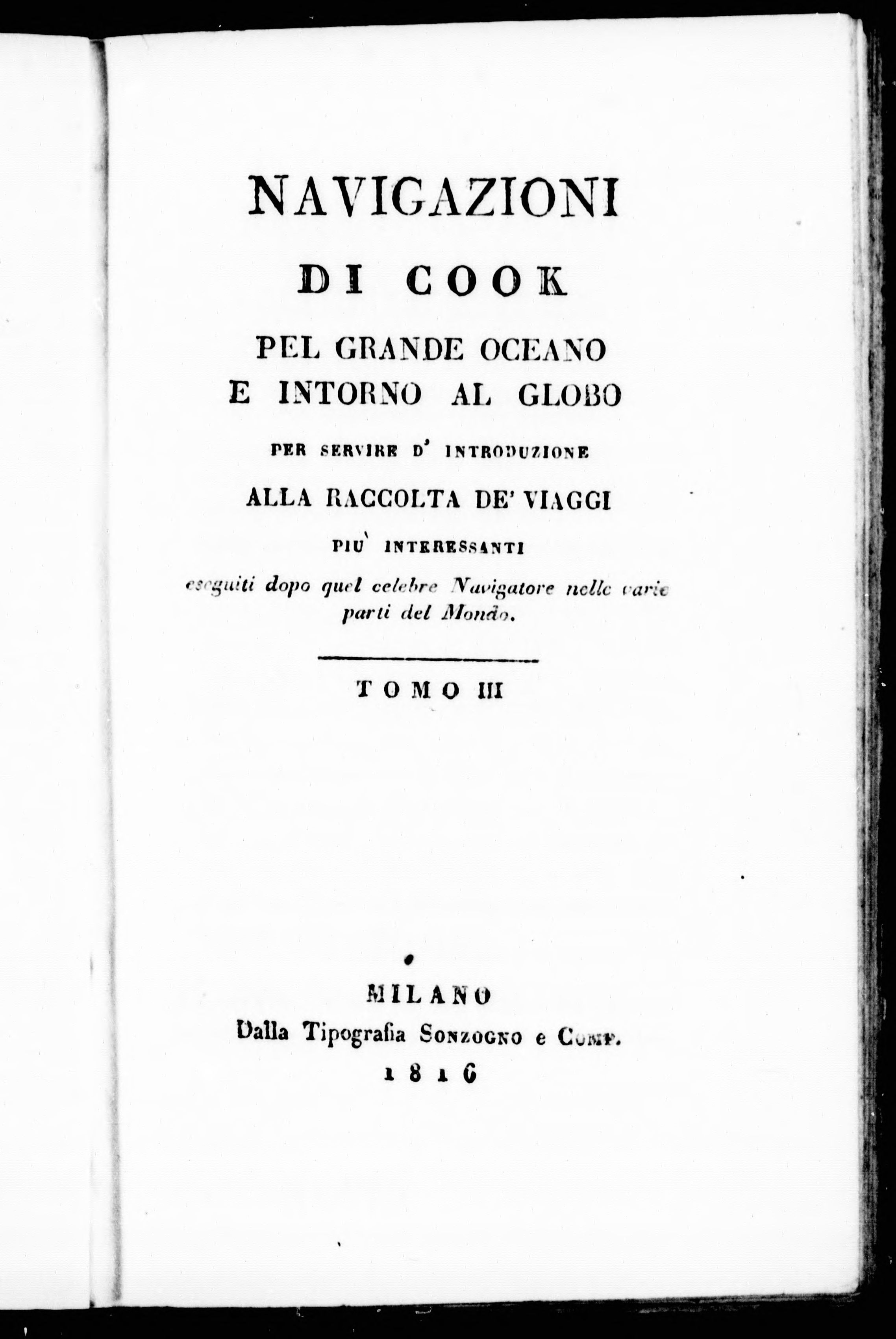 Navigazioni di Cook pel grande oceano e intorno al globo : per servire d'introduzione alla raccolta de' viaggi : più interessanti eseguiti dopo quel celebre navigatore nelle varie parti del mondo.