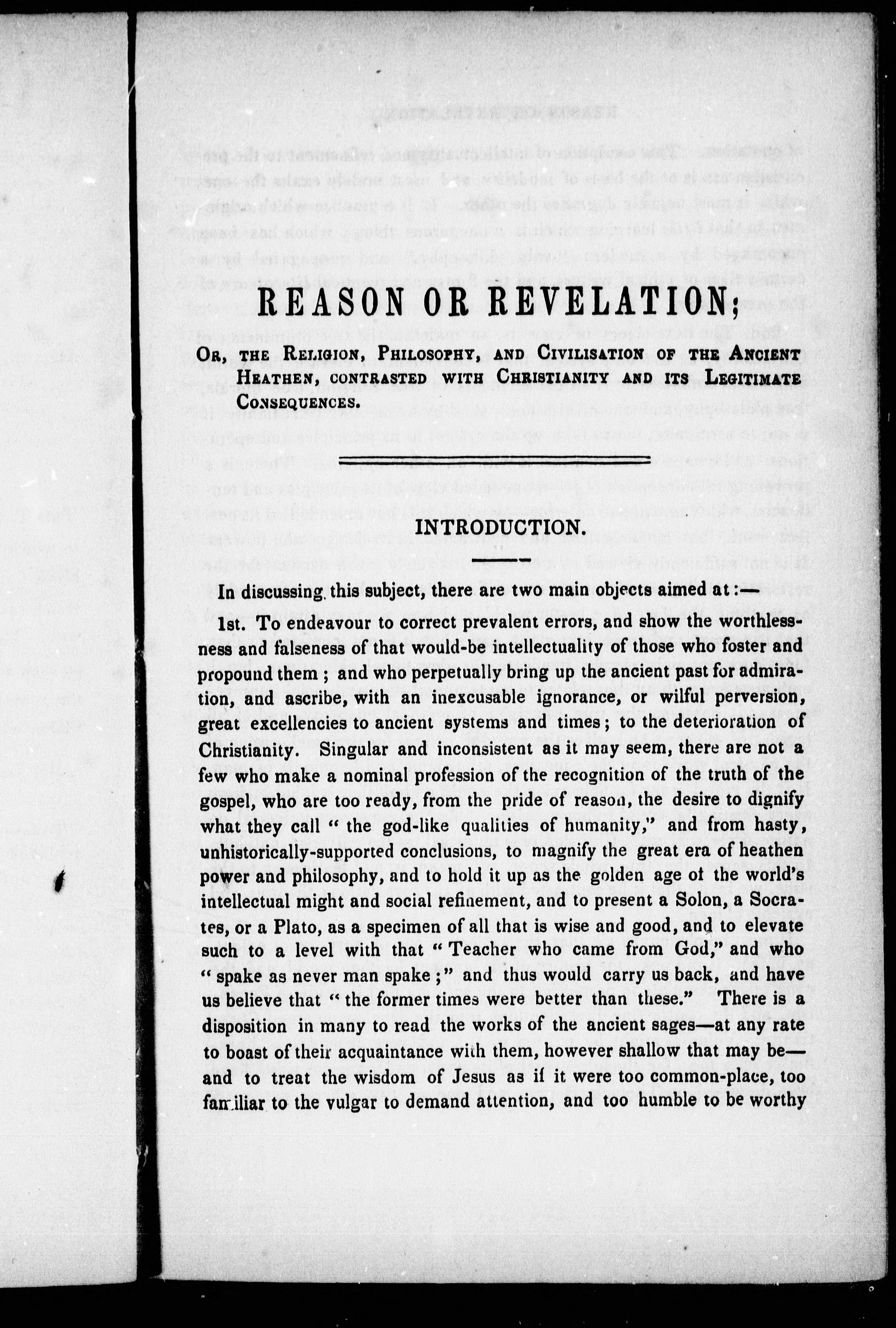 Reason or revelation, or, The religion, philosophy and civilisation of the ancient heathen contrasted with Christianity and its legitimate consequences
