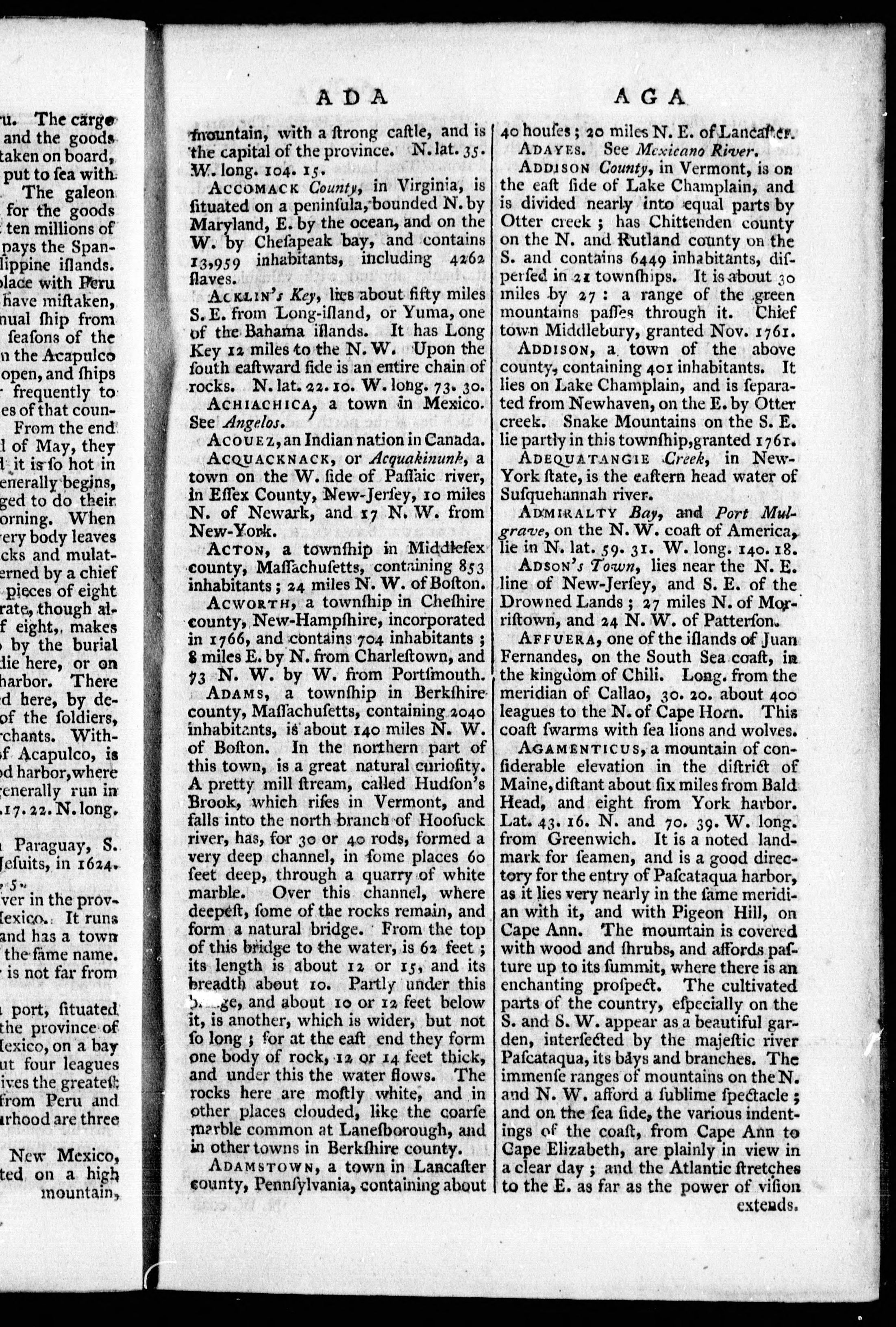 American gazetteer : exhibiting in alphabetical order a much more full and accurate account than has been given of the states, provinces, counties, cities, towns, villages, rivers, bay, harbours, gulfs, sounds, capes, mountains, forts, Indian tribes & new discoveries on the American continent, also of the West India islands and other islands appendant to the continent, and those newly discovered in the Pacific Ocean : describing the extent, boundaries, population, government, productions, commerce ... with a particular description of the Georgia Western Territory : the whole comprising upwards of seven thousand distinct articles