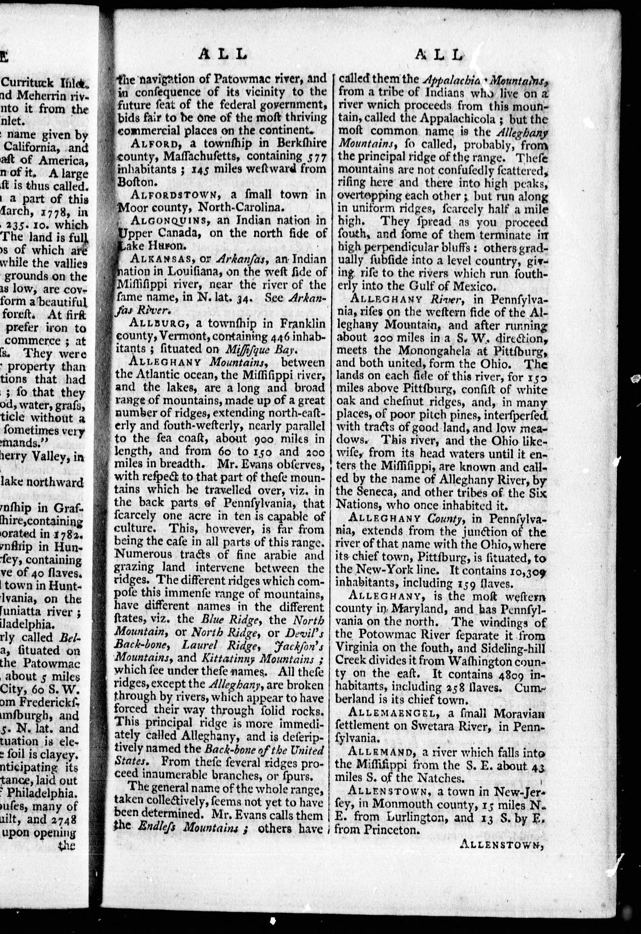 American gazetteer : exhibiting in alphabetical order a much more full and accurate account than has been given of the states, provinces, counties, cities, towns, villages, rivers, bay, harbours, gulfs, sounds, capes, mountains, forts, Indian tribes & new discoveries on the American continent, also of the West India islands and other islands appendant to the continent, and those newly discovered in the Pacific Ocean : describing the extent, boundaries, population, government, productions, commerce ... with a particular description of the Georgia Western Territory : the whole comprising upwards of seven thousand distinct articles