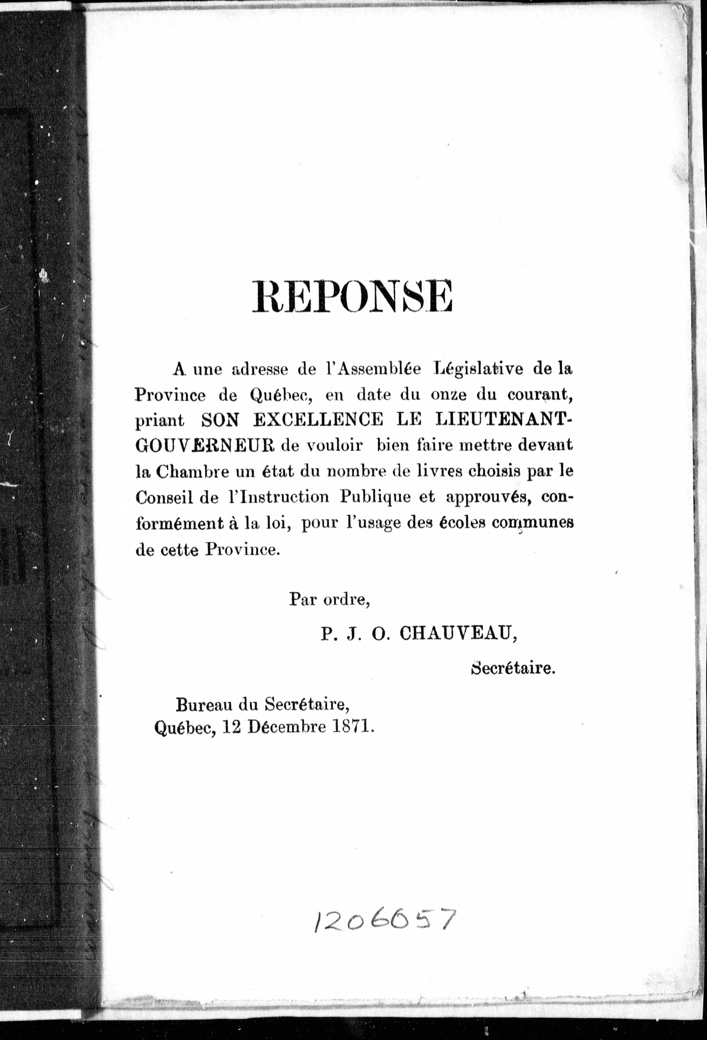 Réponse à une adresse de l'Assemblée législative de la province de Québec en date du onze du courant : priant Son Excellence le lieutenant gouverneur, de vouloir bien faire mettre devant la chambre un état du nombre de livres choisis ..