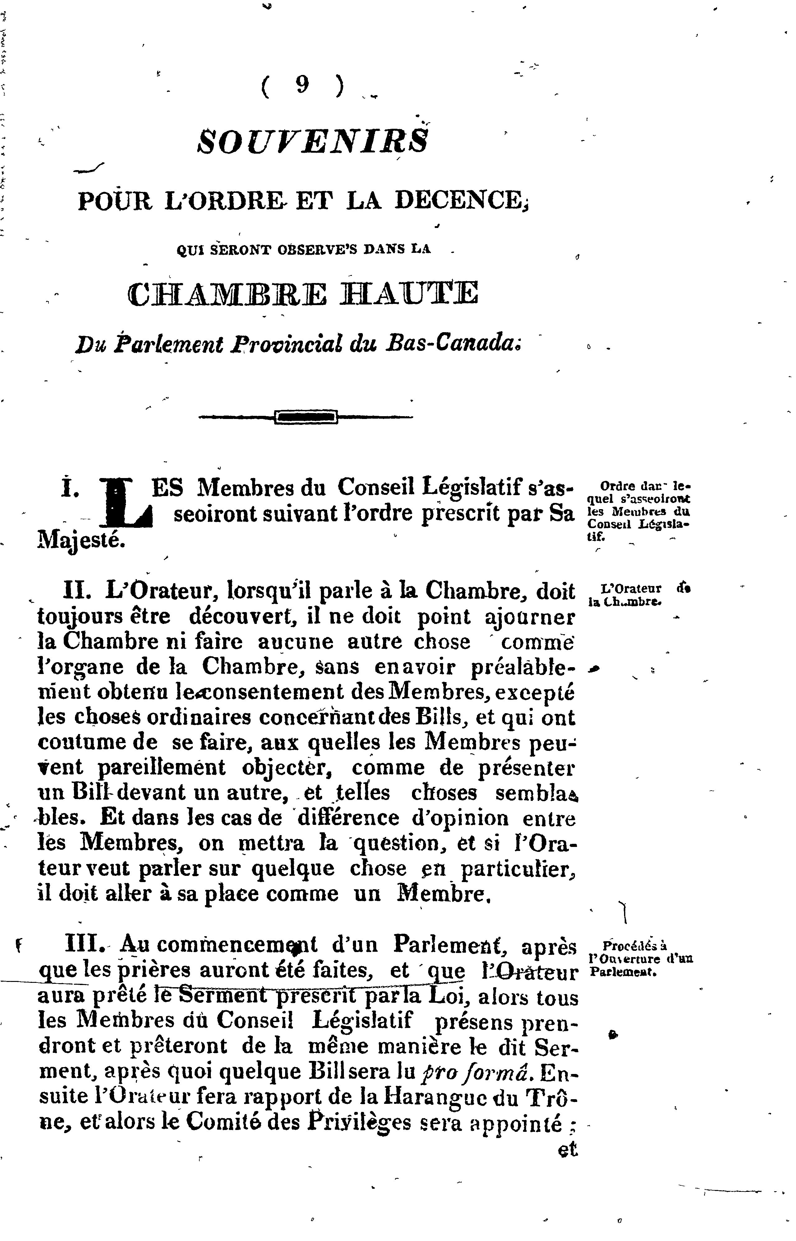 Souvenirs ou Recueil des ordres permanens du Conseil législatif de la Province du Bas-Canada.