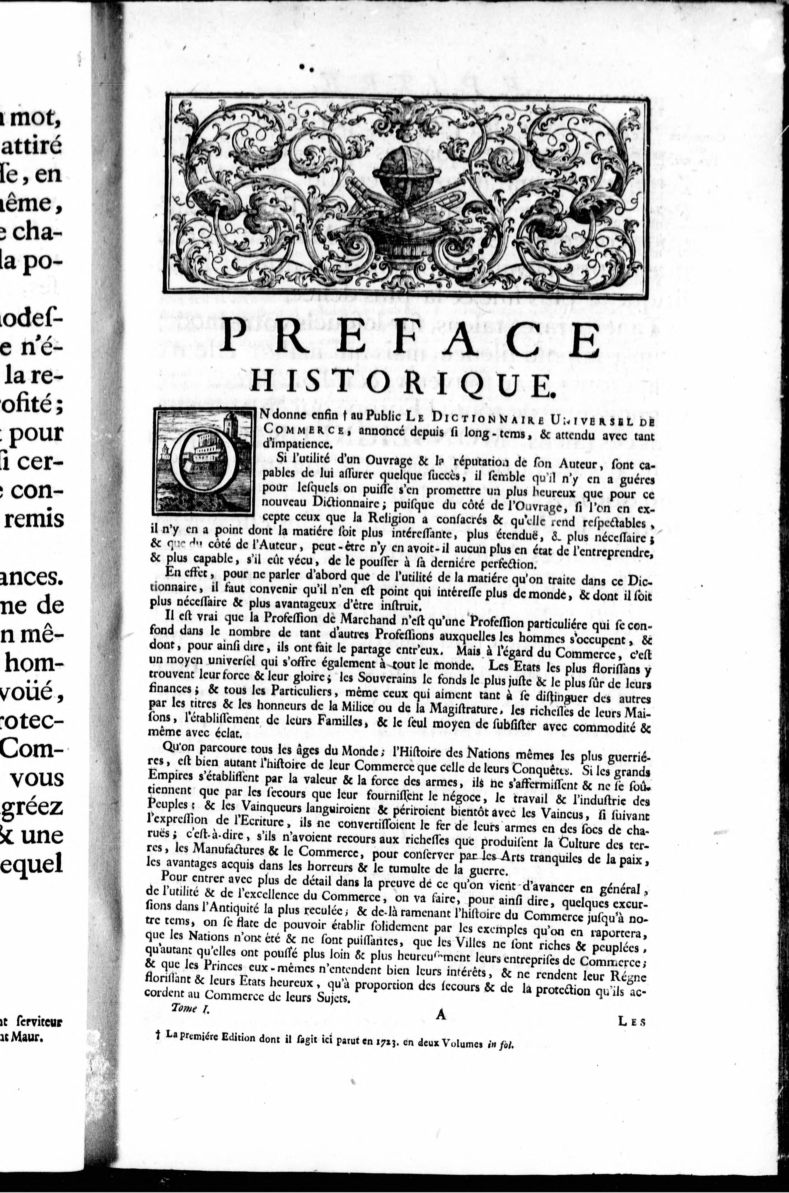 Faux-titre: Dictionnaire universel de commerce, d'histoire naturelle, et des arts et metiers : divisé en III volumes and en IV parties : tome premier, A--C.