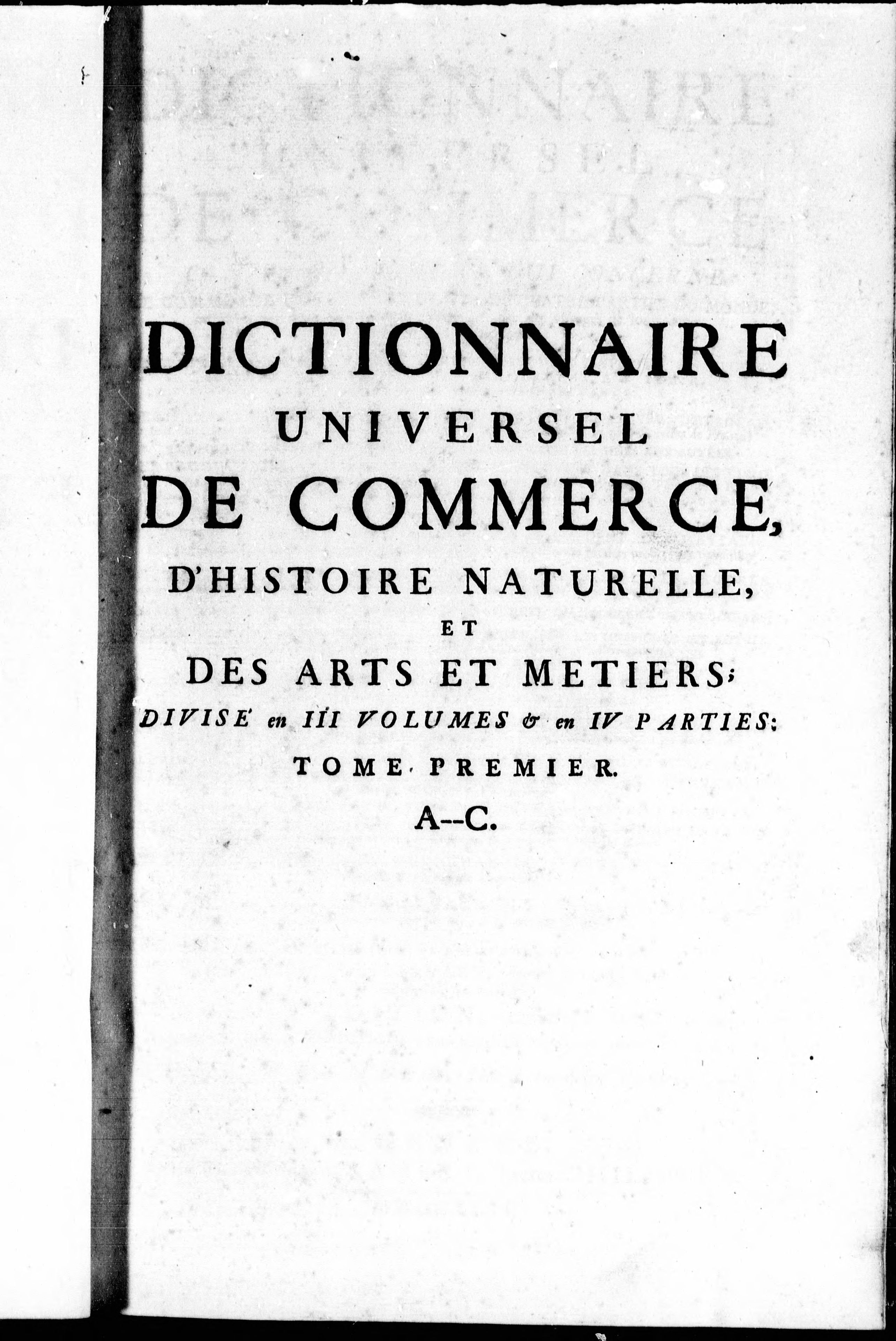 Faux-titre: Dictionnaire universel de commerce, d'histoire naturelle, et des arts et metiers : divisé en III volumes and en IV parties : tome premier, A--C.