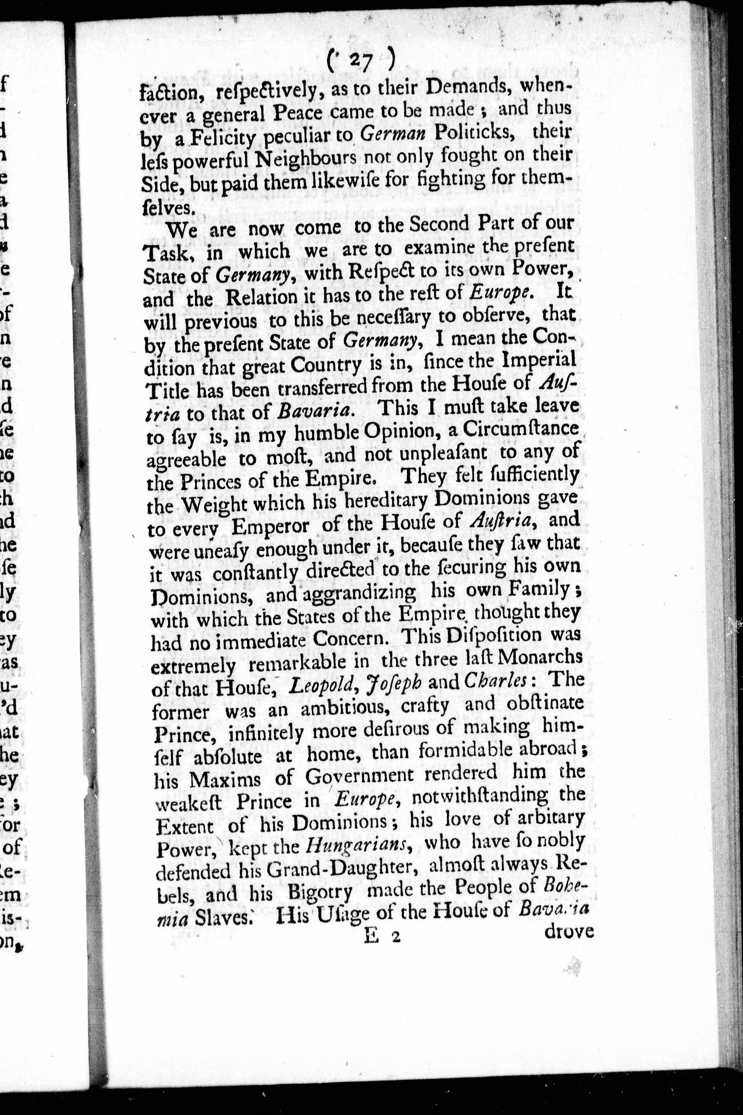 German politicks [sic], or, The modern system examined and refuted : wherein the natural strength of Germany and France are compared, the nature of the ballance [sic] of power explained and our inability to maintain, in our present circumstances, a war on the continent is demonstrated. - Published