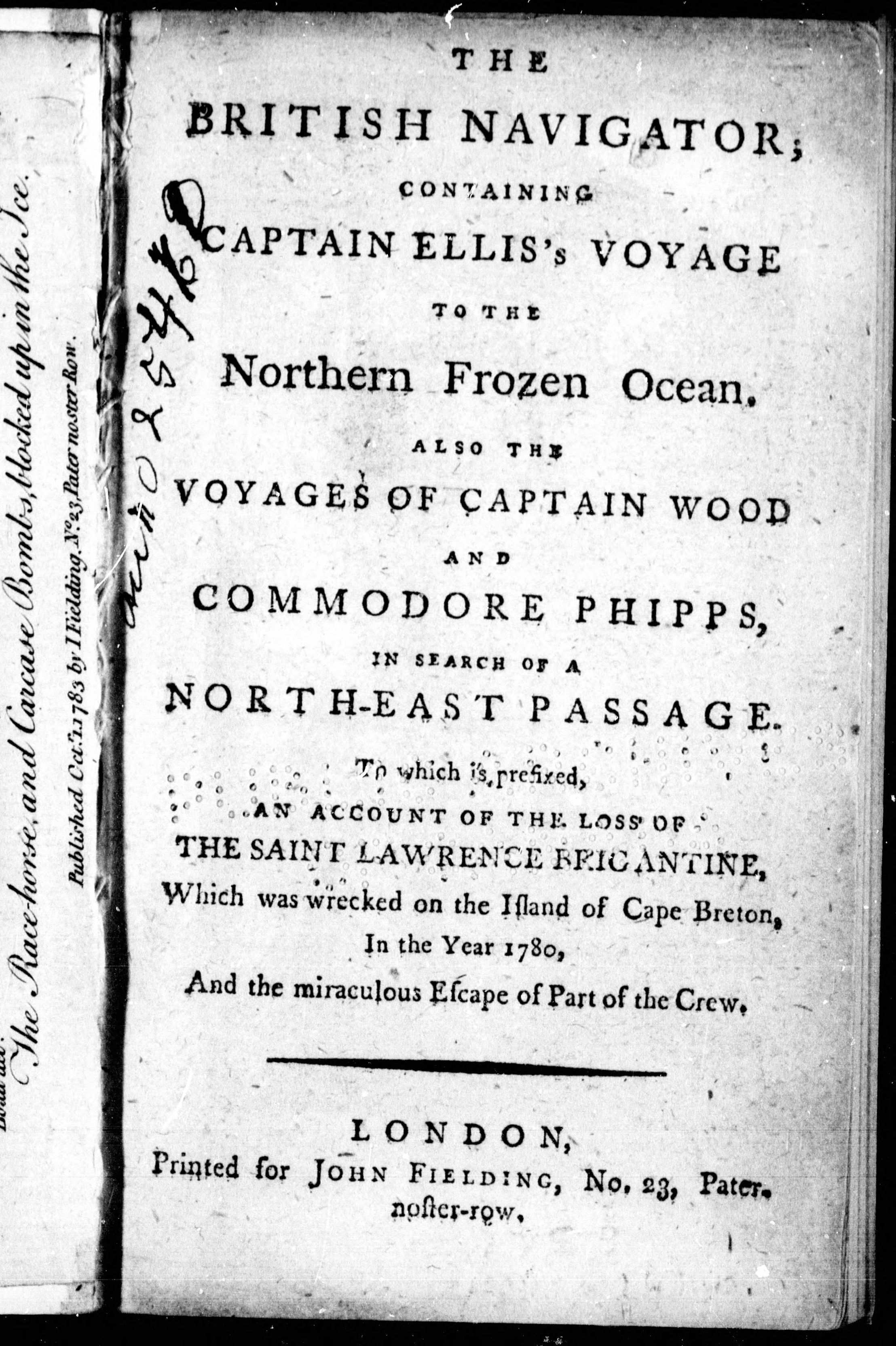 - The British navigator : containing Captain Ellis's voyage to the northern frozen ocean : also the voyages of Captain Wood and Commodore Phipps, in search of a north-east passage : to which is prefixed, an account of the loss of the Saint Lawrence brigantine, which was wrecked on the island of Cape Breton, in the year 1780, and the miraculous escape of part of the crew.