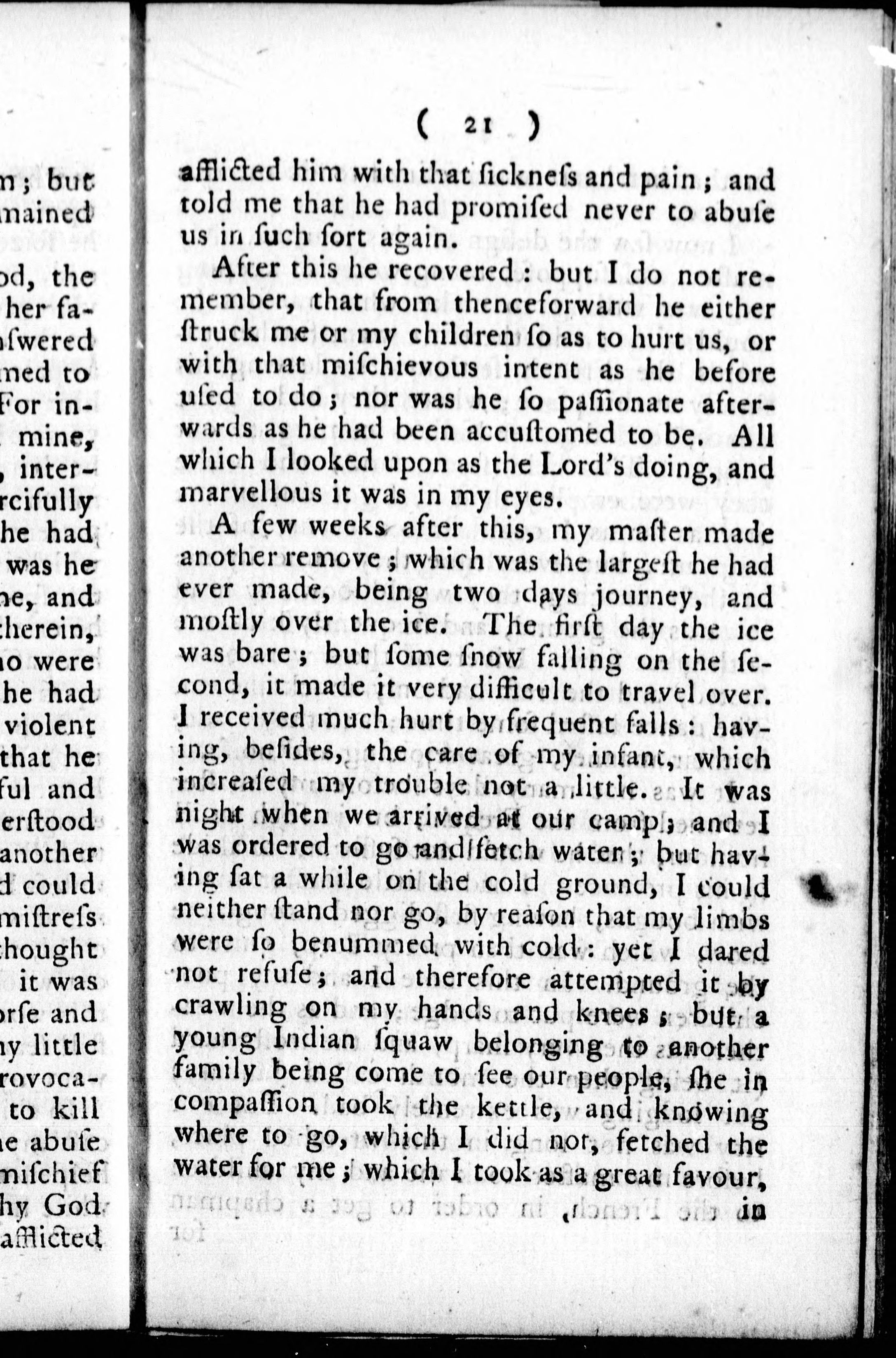 - An account of the captivity of Elizabeth Hanson, late of Kachecky in New-England : who with four of her children, and servant-maid was taken captive by the Indians and carried into Canada : setting forth the various remarkable occurrences, sore trials and wonderful deliverances which befel them after their departure to the time of their redemption